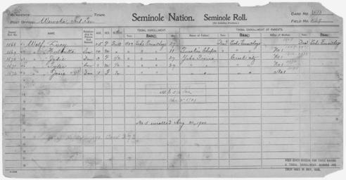 | Keywords: Enrollment for Seminole Census Card 469 - NARA - 268043.tif Scope and content Name Tusekia Chupco Type Parent Sex Male City of Residence ee Name Yaha Fixico Type Parent Sex Male City of Residence Creek Name Hulbutta Wolf Type By Blood Age 10 Sex Male Degree Indian Blood Full Roll Number 1569 City of Residence ee Name Josie Wolf Type By Blood Age 1 Sex Female Degree Indian Blood 1/2 Roll Number 1572 City of Residence ee Name Judie Wolf Type By Blood Age 3 Sex Female Degree Indian Blood 1/2 Roll Number 1570 City of Residence ee Name Lucy Wolf Type By Blood Age 25 Sex Female Degree Indian Blood Full Roll Number 1568 City of Residence ee Name Tyler Wolf Type By Blood Age 1 Sex Male Degree Indian Blood 1/2 Roll Number 1571 City of Residence ee General notes 268043 Local identifier 75-53A-SEMINOLE 469 Department of the Interior Office of Indian Affairs Office of the Commissioner to the Five Civilized Tribes 1893 - 1914 NARA's Southwest Region Fort Worth NRFA 1400 John Burgess Drive Fort Worth TX 76140 Record group Record Group 75 Records of the Bureau of Indian Affairs 1793 - 1999 Record group ARC 404 Enrollment Cards compiled 1898 - 1914 Series ARC 251747 File unit File unit ARC Variant control numbers NAIL Control Number NRFF-75-53A-28164<br /> NAIL Control Number NRFF-75-53A-32141<br /> NAIL Control Number NRFF-75-53A-51836<br /> NAIL Control Number NRFF-75-53A-51857<br /> NAIL Control Number NRFF-75-53A-51858<br /> NAIL Control Number NRFF-75-53A-51868<br /> NAIL Control Number NRFF-75-53A-51903<br /> NAIL Control Number NRFF-75-53A-SEMINOLE 469 yes Other versions <gallery> File Enrollment_for_Seminole_Census_Card_469_-_NARA_-_268043 tif tif File Enrollment_for_Seminole_Census_Card_469_-_NARA_-_268043 jpg jpg </gallery> NARA-cooperation PD-USGov Seminole census cards NARA TIF images with categorized JPGs |