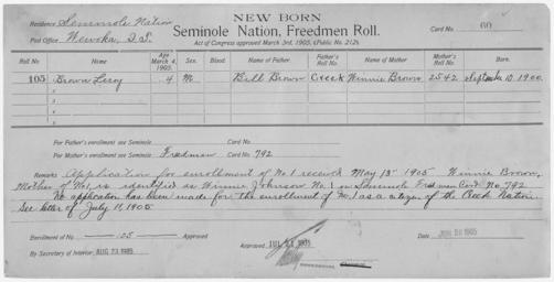 Keywords: Enrollment for Seminole Census Card 60 - NARA - 267634.tif Scope and content Name Cotcha Holatka Type By Blood Age 60 Sex Male Degree Indian Blood Full Roll Number 220 City of Residence tp Name Hulley Holatka Type By Blood Age 10 Sex Male Degree Indian Blood Full Roll Number 222 City of Residence tp Name Parnosky Holatka Type By Blood Age 18 Sex Male Degree Indian Blood Full Roll Number 221 City of Residence tp Name Suwelage Type Parent Sex Female City of Residence tp Name Leroy Brown Type Newborn Freedmen-Rejected Age 4 Sex Male Degree Indian Blood Not Reported Roll Number 105 Post Office Wewoka General notes 267634 Local identifier 75-53A-SEMINOLE 60 Department of the Interior Office of Indian Affairs Office of the Commissioner to the Five Civilized Tribes 1893 - 1914 NARA's Southwest Region Fort Worth NRFA 1400 John Burgess Drive Fort Worth TX 76140 Record group Record Group 75 Records of the Bureau of Indian Affairs 1793 - 1999 Record group ARC 404 Enrollment Cards compiled 1898 - 1914 Series ARC 251747 File unit File unit ARC Variant control numbers NAIL Control Number NRFF-75-53A-36543<br /> NAIL Control Number NRFF-75-53A-36546<br /> NAIL Control Number NRFF-75-53A-36547<br /> NAIL Control Number NRFF-75-53A-48456<br /> NAIL Control Number NRFF-75-53A-52896<br /> NAIL Control Number NRFF-75-53A-SEMINOLE 60 yes Other versions <gallery> File Enrollment_for_Seminole_Census_Card_60_-_NARA_-_267634 tif tif File Enrollment_for_Seminole_Census_Card_60_-_NARA_-_267634 jpg jpg </gallery> NARA-cooperation PD-USGov Cherokee census cards Seminole census cards NARA TIF images with categorized JPGs |