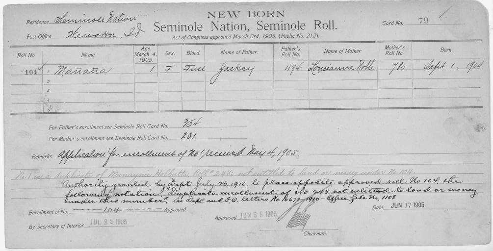 Keywords: Enrollment for Seminole Census Card 79 - NARA - 267653.jpg Scope and content Name Manana Type Newborn Age 1 Sex Female Degree Indian Blood FULL Roll Number 104 Post Office Wewoka Name Billy Chupcogee Type By Blood Age 25 Sex Male Degree Indian Blood Full Roll Number 279 City of Residence tp Name Ellen Chupcogee Type By Blood Age 3 Sex Female Degree Indian Blood Full Roll Number 281 City of Residence th Name Lisa Chupcogee Type By Blood Age 27 Sex Female Degree Indian Blood Full City of Residence th Name Wilsey Chupcogee Type By Blood Age 7 Sex Male Degree Indian Blood Full Roll Number 280 City of Residence th Name Neha Harjo Type Parent Sex Male City of Residence ee Name Louisa Type Parent Sex Female City of Residence tp Name John Wakey Type Parent Sex Male City of Residence th Name Willagipey Type Parent Sex Female City of Residence th Name Joe Crawford Peoples Type Newborn Freedmen-Rejected Age 2 Sex Male Degree Indian Blood Not Reported Roll Number 86 Post Office Wewoka General notes 267653 Local identifier 75-53A-SEMINOLE 79 Department of the Interior Office of Indian Affairs Office of the Commissioner to the Five Civilized Tribes 1893 - 1914 NARA's Southwest Region Fort Worth NRFA 1400 John Burgess Drive Fort Worth TX 76140 Record group Record Group 75 Records of the Bureau of Indian Affairs 1793 - 1999 Record group ARC 404 Enrollment Cards compiled 1898 - 1914 Series ARC 251747 File unit File unit ARC Variant control numbers NAIL Control Number NRFF-75-53A-28178<br /> NAIL Control Number NRFF-75-53A-28179<br /> NAIL Control Number NRFF-75-53A-28180<br /> NAIL Control Number NRFF-75-53A-28181<br /> NAIL Control Number NRFF-75-53A-34827<br /> NAIL Control Number NRFF-75-53A-39930<br /> NAIL Control Number NRFF-75-53A-50435<br /> NAIL Control Number NRFF-75-53A-51334<br /> NAIL Control Number NRFF-75-53A-52637<br /> NAIL Control Number NRFF-75-53A-52924<br /> NAIL Control Number NRFF-75-53A-SEMINOLE 79 Other versions <gallery> File Enrollment_for_Seminole_Census_Card_79_-_NARA_-_267653 tif tif File Enrollment_for_Seminole_Census_Card_79_-_NARA_-_267653 jpg jpg </gallery> NARA-cooperation PD-USGov Cherokee census cards |