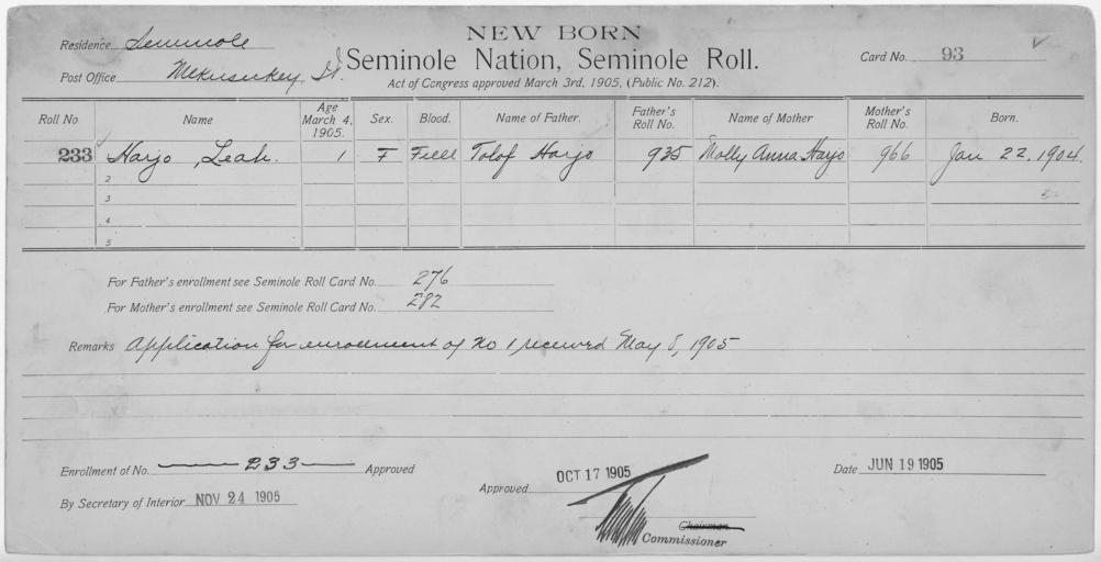 | Keywords: Enrollment for Seminole Census Card 93 - NARA - 267667.jpg Scope and content Name Concharte Type Parent Sex Female City of Residence k Name Konibbe Type Parent Sex Male City of Residence th Name Mabeta Type Parent Sex Female City of Residence tp Name Aha Micco Type Parent Sex Male City of Residence th Name Talmascy Type By Blood Age 40 Sex Male Degree Indian Blood Full Roll Number 323 City of Residence k Name Alfred Talmascy Type By Blood Age 12 Sex Male Degree Indian Blood Full Roll Number 325 City of Residence tp Name Anna Talmascy Type By Blood Age 4 Sex Female Degree Indian Blood Full City of Residence tp Name Eliza Talmascy Type By Blood Age 39 Sex Female Degree Indian Blood Full Roll Number 324 City of Residence tp Name Hoktoche Talmascy Type By Blood Age 1 Sex Female Degree Indian Blood Full Roll Number 328 City of Residence tp Name Kanate Talmascy Type By Blood Age 8 Sex Male Degree Indian Blood Full Roll Number 326 City of Residence tp Name Pussy Talmascy Type By Blood Age 6 Sex Female Degree Indian Blood Full Roll Number 327 City of Residence tp Name Leah Harjo Type Newborn Age 1 Sex Female Degree Indian Blood FULL Roll Number 233 Post Office Mekusukey General notes 267667 Local identifier 75-53A-SEMINOLE 93 Department of the Interior Office of Indian Affairs Office of the Commissioner to the Five Civilized Tribes 1893 - 1914 NARA's Southwest Region Fort Worth NRFA 1400 John Burgess Drive Fort Worth TX 76140 Record group Record Group 75 Records of the Bureau of Indian Affairs 1793 - 1999 Record group ARC 404 Enrollment Cards compiled 1898 - 1914 Series ARC 251747 File unit File unit ARC Variant control numbers NAIL Control Number NRFF-75-53A-28658<br /> NAIL Control Number NRFF-75-53A-38896<br /> NAIL Control Number NRFF-75-53A-40273<br /> NAIL Control Number NRFF-75-53A-41820<br /> NAIL Control Number NRFF-75-53A-48531<br /> NAIL Control Number NRFF-75-53A-48532<br /> NAIL Control Number NRFF-75-53A-48533<br /> NAIL Control Number NRFF-75-53A-48534<br /> NAIL Control Number NRFF-75-53A-48537<br /> NAIL Control Number NRFF-75-53A-48538<br /> NAIL Control Number NRFF-75-53A-48539<br /> NAIL Control Number NRFF-75-53A-52656<br /> NAIL Control Number NRFF-75-53A-SEMINOLE 93 Other versions <gallery> File Enrollment_for_Seminole_Census_Card_93_-_NARA_-_267667 tif tif File Enrollment_for_Seminole_Census_Card_93_-_NARA_-_267667 jpg jpg </gallery> NARA-cooperation PD-USGov Cherokee census cards |