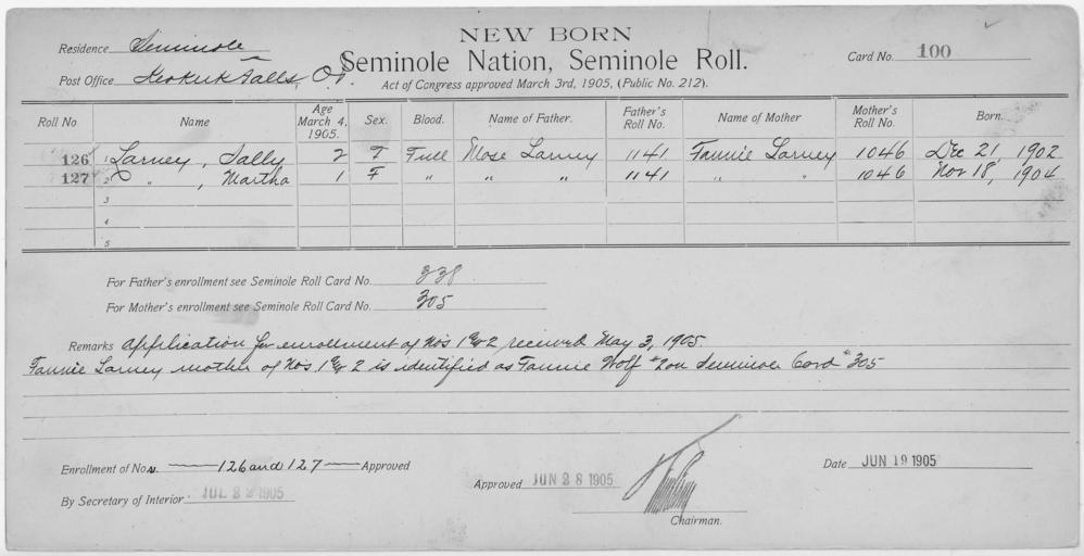 | Keywords: Enrollment for Seminole Census Card 100 - NARA - 267674.jpg Scope and content Name Cookogee Type Parent Sex Male City of Residence tp Name Linda Harjo Type By Blood Age 35 Sex Female Degree Indian Blood Full Roll Number 350 City of Residence yh Name Woxie Harjo Type By Blood Age 33 Sex Male Degree Indian Blood Full Roll Number 349 City of Residence th Name Tusekia Type Parent Sex Male Roll Number 350 City of Residence yh Name Sally Larney Type Newborn Age 2 Sex Female Degree Indian Blood FULL Roll Number 126 Post Office Keokuk Falls Name Martha Larney Type Newborn Age 1 Sex Female Degree Indian Blood FULL Roll Number 127 Post Office Keokuk Falls General notes 267674 Local identifier 75-53A-SEMINOLE 100 Department of the Interior Office of Indian Affairs Office of the Commissioner to the Five Civilized Tribes 1893 - 1914 NARA's Southwest Region Fort Worth NRFA 1400 John Burgess Drive Fort Worth TX 76140 Record group Record Group 75 Records of the Bureau of Indian Affairs 1793 - 1999 Record group ARC 404 Enrollment Cards compiled 1898 - 1914 Series ARC 251747 File unit File unit ARC Variant control numbers NAIL Control Number NRFF-75-53A-28787<br /> NAIL Control Number NRFF-75-53A-34602<br /> NAIL Control Number NRFF-75-53A-35309<br /> NAIL Control Number NRFF-75-53A-50196<br /> NAIL Control Number NRFF-75-53A-52668<br /> NAIL Control Number NRFF-75-53A-52669<br /> NAIL Control Number NRFF-75-53A-SEMINOLE 100 Other versions <gallery> File Enrollment_for_Seminole_Census_Card_100_-_NARA_-_267674 tif tif File Enrollment_for_Seminole_Census_Card_100_-_NARA_-_267674 jpg jpg </gallery> NARA-cooperation PD-USGov Cherokee census cards |