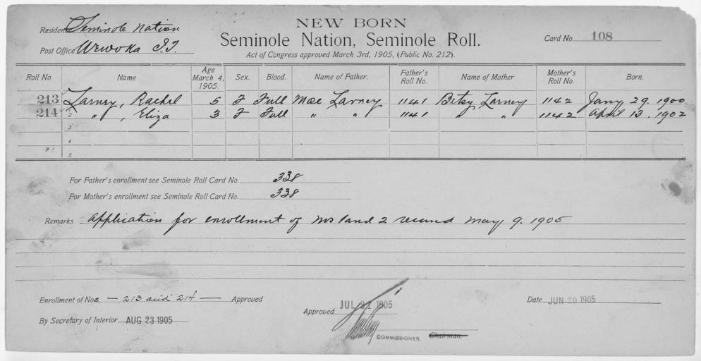 | Keywords: Enrollment for Seminole Census Card 108 - NARA - 267682.jpg Scope and content Name Dinah Type By Blood Age 14 Sex Female Degree Indian Blood Full Roll Number 380 City of Residence yh Name Charlie Harjo Type Parent Sex Male City of Residence tl Name Meka Harjo Type Parent Sex Male City of Residence th Name Mitchile Type By Blood Age 47 Sex Male Degree Indian Blood Full Roll Number 377 City of Residence th Name Sakteke Type By Blood Age 35 Sex Female Degree Indian Blood Full Roll Number 378 City of Residence yh Name Samuel Type By Blood Age 1 Sex Male Degree Indian Blood Full Roll Number 382 City of Residence yh Name Tusechokte Type Parent Sex Female City of Residence yh Name Webster Type By Blood Age 10 Sex Male Degree Indian Blood Full Roll Number 381 City of Residence yh Name Willie Type By Blood Age 17 Sex Male Degree Indian Blood Full Roll Number 379 City of Residence yh Name Rachel Larney Type Newborn Age 5 Sex Female Degree Indian Blood FULL Roll Number 213 Post Office Wewoka Name Eliza Larney Type Newborn Age 3 Sex Female Degree Indian Blood FULL Roll Number 214 Post Office Wewoka General notes 267682 Local identifier 75-53A-SEMINOLE 108 Department of the Interior Office of Indian Affairs Office of the Commissioner to the Five Civilized Tribes 1893 - 1914 NARA's Southwest Region Fort Worth NRFA 1400 John Burgess Drive Fort Worth TX 76140 Record group Record Group 75 Records of the Bureau of Indian Affairs 1793 - 1999 Record group ARC 404 Enrollment Cards compiled 1898 - 1914 Series ARC 251747 File unit File unit ARC Variant control numbers NAIL Control Number NRFF-75-53A-30428<br /> NAIL Control Number NRFF-75-53A-34160<br /> NAIL Control Number NRFF-75-53A-34725<br /> NAIL Control Number NRFF-75-53A-42345<br /> NAIL Control Number NRFF-75-53A-45573<br /> NAIL Control Number NRFF-75-53A-45714<br /> NAIL Control Number NRFF-75-53A-50195<br /> NAIL Control Number NRFF-75-53A-50928<br /> NAIL Control Number NRFF-75-53A-51462<br /> NAIL Control Number NRFF-75-53A-52678<br /> NAIL Control Number NRFF-75-53A-52679<br /> NAIL Control Number NRFF-75-53A-SEMINOLE 108 Other versions <gallery> File Enrollment_for_Seminole_Census_Card_108_-_NARA_-_267682 tif tif File Enrollment_for_Seminole_Census_Card_108_-_NARA_-_267682 jpg jpg </gallery> NARA-cooperation PD-USGov Cherokee census cards |
