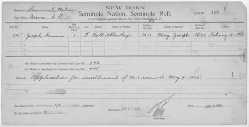 | Keywords: Enrollment for Seminole Census Card 139 - NARA - 267713.jpg  Scope and content Name Cartcher Fege Type Parent Sex Male City of Residence tp Name Jacksee Type Parent Sex Male Name Judy Type By Blood Age 42 Sex Female Degree Indian Blood Full Roll Number 476 City of Residence th Name Mesale Type By Blood Age 12 Sex Female Degree Indian Blood Full Roll Number 480 City of Residence th Name Missena Type By Blood Age 10 Sex Female Degree Indian Blood Full Roll Number 481 City of Residence th Name Mosar Type By Blood Age 17 Sex Male Degree Indian Blood Full Roll Number 477 City of Residence th Name Parney Type By Blood Age 15 Sex Male Degree Indian Blood Full Roll Number 478 City of Residence th Name Telar Type Parent Sex Male Name Tobie Type By Blood Age 13 Sex Male Degree Indian Blood Full Roll Number 479 City of Residence th Name Tuscooner Type Parent Sex Male City of Residence th Name Fannie Joseph Type Newborn Age 1 Sex Female Degree Indian Blood FULL Roll Number 170 Post Office Irene General notes 267713 Local identifier 75-53A-SEMINOLE 139 Department of the Interior Office of Indian Affairs Office of the Commissioner to the Five Civilized Tribes 1893 - 1914 NARA's Southwest Region Fort Worth NRFA 1400 John Burgess Drive Fort Worth TX 76140 Record group Record Group 75 Records of the Bureau of Indian Affairs 1793 - 1999 Record group ARC 404 Enrollment Cards compiled 1898 - 1914 Series ARC 251747 File unit File unit ARC Variant control numbers NAIL Control Number NRFF-75-53A-31359<br /> NAIL Control Number NRFF-75-53A-37270<br /> NAIL Control Number NRFF-75-53A-38196<br /> NAIL Control Number NRFF-75-53A-41800<br /> NAIL Control Number NRFF-75-53A-42268<br /> NAIL Control Number NRFF-75-53A-42710<br /> NAIL Control Number NRFF-75-53A-43591<br /> NAIL Control Number NRFF-75-53A-48852<br /> NAIL Control Number NRFF-75-53A-49961<br /> NAIL Control Number NRFF-75-53A-50194<br /> NAIL Control Number NRFF-75-53A-52723<br /> NAIL Control Number NRFF-75-53A-SEMINOLE 139 Other versions <gallery> File Enrollment_for_Seminole_Census_Card_139_-_NARA_-_267713 tif tif File Enrollment_for_Seminole_Census_Card_139_-_NARA_-_267713 jpg jpg </gallery> NARA-cooperation PD-USGov Cherokee census cards |