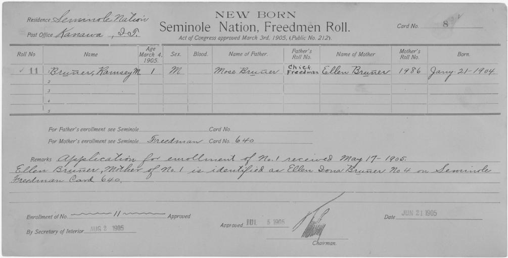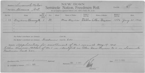 Keywords: Enrollment for Seminole Census Card 8 - NARA - 267582.jpg Scope and content Name Jonathan F Brown Type Parent Sex Male Name Alexander W Crain Type By Blood Age 51 Sex Male Degree Indian Blood AW Roll Number 24 City of Residence o Name Allen W Crain Type By Blood Age 14 Sex Male Degree Indian Blood 1/4 Roll Number 27 City of Residence tp Name Ambrose M Crain Type By Blood Age 12 Sex Male Degree Indian Blood 1/4 Roll Number 28 City of Residence tp Name Anna E Crain Type By Blood Age 16 Sex Female Degree Indian Blood 1/4 Roll Number 26 City of Residence tp Name Joseph Crain Type Parent Sex Male Name Lucy Crain Type By Blood Age 51 Sex Female Degree Indian Blood 1/2 Roll Number 25 City of Residence tp Name Rebecca Crain Type Parent Sex Female Name Luucy Type Parent Sex Female City of Residence tp Name Ramsey M Bruner Type Newborn Freedmen-Rejected Age 1 Sex Male Degree Indian Blood Not Reported Roll Number 11 Post Office Kanawa General notes 267582 Local identifier 75-53A-SEMINOLE 8 Department of the Interior Office of Indian Affairs Office of the Commissioner to the Five Civilized Tribes 1893 - 1914 NARA's Southwest Region Fort Worth NRFA 1400 John Burgess Drive Fort Worth TX 76140 Record group Record Group 75 Records of the Bureau of Indian Affairs 1793 - 1999 Record group ARC 404 Enrollment Cards compiled 1898 - 1914 Series ARC 251747 File unit File unit ARC Variant control numbers NAIL Control Number NRFF-75-53A-25824<br /> NAIL Control Number NRFF-75-53A-29085<br /> NAIL Control Number NRFF-75-53A-29086<br /> NAIL Control Number NRFF-75-53A-29087<br /> NAIL Control Number NRFF-75-53A-29088<br /> NAIL Control Number NRFF-75-53A-29092<br /> NAIL Control Number NRFF-75-53A-29093<br /> NAIL Control Number NRFF-75-53A-29094<br /> NAIL Control Number NRFF-75-53A-40223<br /> NAIL Control Number NRFF-75-53A-52808<br /> NAIL Control Number NRFF-75-53A-SEMINOLE 8 Other versions <gallery> File Enrollment_for_Seminole_Census_Card_8_-_NARA_-_267582 tif tif File Enrollment_for_Seminole_Census_Card_8_-_NARA_-_267582 jpg jpg </gallery> NARA-cooperation PD-USGov Seminole census cards Konawa Oklahoma |