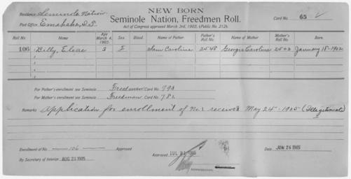 | Keywords: Enrollment for Seminole Census Card 65 - NARA - 267639.jpg Scope and content Name Amos Type By Blood Age 7 Sex Male Degree Indian Blood Full Roll Number 243 City of Residence th Name Chucoluse Type Parent Sex Male City of Residence th Name Hodulga Fixico Type Parent Sex Male City of Residence ee Name Hoktochee Type By Blood Age 38 Sex Female Degree Indian Blood Full Roll Number 240 City of Residence th Name Hulchoke Type Parent Sex Female Name Thomas Jefferson Type By Blood Age 37 Sex Male Degree Indian Blood Full Roll Number 239 City of Residence th Name Sammah Type By Blood Age 25 Sex Male Degree Indian Blood Full Roll Number 241 City of Residence th Name Selgah Type Parent Sex Female City of Residence th Name Williamse Type By Blood Age 21 Sex Male Degree Indian Blood Full Roll Number 242 City of Residence th Name Woxie Yoholar Type Parent Sex Male City of Residence yh Name Elene Billy Type Newborn Freedmen-Rejected Age 3 Sex Female Degree Indian Blood Not Reported Roll Number 106 Post Office Emahaka General notes 267639 Local identifier 75-53A-SEMINOLE 65 Department of the Interior Office of Indian Affairs Office of the Commissioner to the Five Civilized Tribes 1893 - 1914 NARA's Southwest Region Fort Worth NRFA 1400 John Burgess Drive Fort Worth TX 76140 Record group Record Group 75 Records of the Bureau of Indian Affairs 1793 - 1999 Record group ARC 404 Enrollment Cards compiled 1898 - 1914 Series ARC 251747 File unit File unit ARC Variant control numbers NAIL Control Number NRFF-75-53A-23089<br /> NAIL Control Number NRFF-75-53A-28026<br /> NAIL Control Number NRFF-75-53A-31914<br /> NAIL Control Number NRFF-75-53A-36517<br /> NAIL Control Number NRFF-75-53A-36881<br /> NAIL Control Number NRFF-75-53A-37512<br /> NAIL Control Number NRFF-75-53A-45657<br /> NAIL Control Number NRFF-75-53A-46576<br /> NAIL Control Number NRFF-75-53A-51457<br /> NAIL Control Number NRFF-75-53A-52583<br /> NAIL Control Number NRFF-75-53A-52903<br /> NAIL Control Number NRFF-75-53A-SEMINOLE 65 Other versions <gallery> File Enrollment_for_Seminole_Census_Card_65_-_NARA_-_267639 tif tif File Enrollment_for_Seminole_Census_Card_65_-_NARA_-_267639 jpg jpg </gallery> NARA-cooperation PD-USGov Cherokee census cards Seminole census cards |