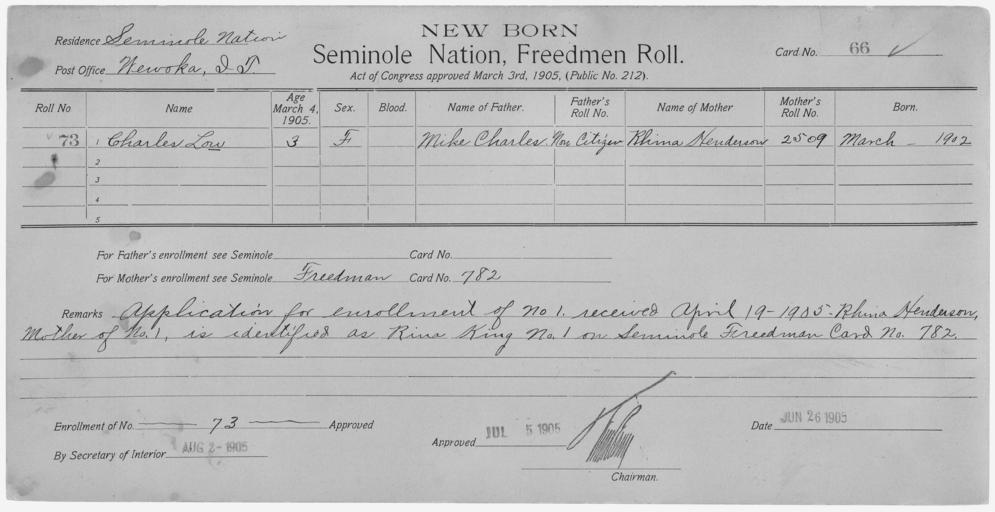| Keywords: Enrollment for Seminole Census Card 66 - NARA - 267640.jpg Scope and content Name Carcher Chupco Type Parent Sex Male City of Residence ee Name Hagie Type Parent Sex Female City of Residence ee Name Jennie Type By Blood Age 3 Sex Female Degree Indian Blood Full Roll Number 246 City of Residence ee Name Wetley Type By Blood Age 10 Sex Male Degree Indian Blood Full Roll Number 245 City of Residence ee Name Willie Type By Blood Age 25 Sex Female Degree Indian Blood Full Roll Number 244 City of Residence ee Name Lou Charles Type Newborn Freedmen-Rejected Age 3 Sex Female Degree Indian Blood Not Reported Roll Number 73 Post Office Wewoka General notes 267640 Local identifier 75-53A-SEMINOLE 66 Department of the Interior Office of Indian Affairs Office of the Commissioner to the Five Civilized Tribes 1893 - 1914 NARA's Southwest Region Fort Worth NRFA 1400 John Burgess Drive Fort Worth TX 76140 Record group Record Group 75 Records of the Bureau of Indian Affairs 1793 - 1999 Record group ARC 404 Enrollment Cards compiled 1898 - 1914 Series ARC 251747 File unit File unit ARC Variant control numbers NAIL Control Number NRFF-75-53A-28059<br /> NAIL Control Number NRFF-75-53A-33767<br /> NAIL Control Number NRFF-75-53A-37549<br /> NAIL Control Number NRFF-75-53A-51115<br /> NAIL Control Number NRFF-75-53A-51461<br /> NAIL Control Number NRFF-75-53A-52904<br /> NAIL Control Number NRFF-75-53A-SEMINOLE 66 Other versions <gallery> File Enrollment_for_Seminole_Census_Card_66_-_NARA_-_267640 tif tif File Enrollment_for_Seminole_Census_Card_66_-_NARA_-_267640 jpg jpg </gallery> NARA-cooperation PD-USGov Cherokee census cards Seminole census cards |