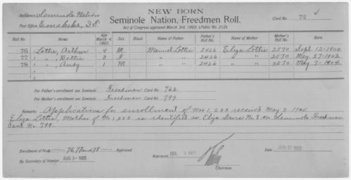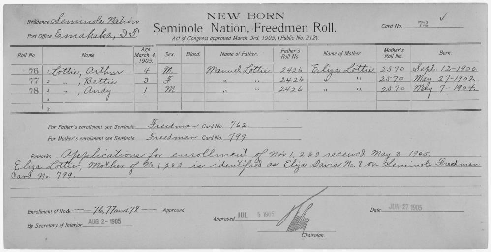 | Keywords: Enrollment for Seminole Census Card 72 - NARA - 267646.jpg  Scope and content Name Hobaye Bam Type Parent Sex Male City of Residence Creek Name Liddey Type Parent Sex Female City of Residence e Name Madelia Type Parent Sex Female City of Residence tp Name Jack Palmer Type Parent Sex Male City of Residence Creek Name Jim Palmer Type By Blood Age 17 Sex Male Degree Indian Blood 1/2 Roll Number 266 City of Residence e Name Legus Palmer Type By Blood Age 6 Sex Male Degree Indian Blood 3/4 Roll Number 265 City of Residence e Name Sarney Palmer Type By Blood Age 13 Sex Male Degree Indian Blood 3/4 Roll Number 262 City of Residence e Name Thomas Palmer Type By Blood Age 39 Sex Male Degree Indian Blood 1/2 Roll Number 261 City of Residence tp Name Willey Palmer Type By Blood Age 11 Sex Male Degree Indian Blood 3/4 Roll Number 263 City of Residence e Name Wilsey Palmer Type By Blood Age 9 Sex Male Degree Indian Blood 3/4 Roll Number 264 City of Residence e Name Arthur Lottie Type Newborn Freedmen-Rejected Age 4 Sex Male Degree Indian Blood Not Reported Roll Number 76 Post Office Emahaka Name Bettie Lottie Type Newborn Freedmen-Rejected Age 3 Sex Female Degree Indian Blood Not Reported Roll Number 77 Post Office Emahaka Name Andy Lottie Type Newborn Freedmen-Rejected Age 1 Sex Male Degree Indian Blood Not Reported Roll Number 78 Post Office Emahaka General notes 267646 Local identifier 75-53A-SEMINOLE 72 Department of the Interior Office of Indian Affairs Office of the Commissioner to the Five Civilized Tribes 1893 - 1914 NARA's Southwest Region Fort Worth NRFA 1400 John Burgess Drive Fort Worth TX 76140 Record group Record Group 75 Records of the Bureau of Indian Affairs 1793 - 1999 Record group ARC 404 Enrollment Cards compiled 1898 - 1914 Series ARC 251747 File unit File unit ARC Variant control numbers NAIL Control Number NRFF-75-53A-23687<br /> NAIL Control Number NRFF-75-53A-39445<br /> NAIL Control Number NRFF-75-53A-40281<br /> NAIL Control Number NRFF-75-53A-43507<br /> NAIL Control Number NRFF-75-53A-43514<br /> NAIL Control Number NRFF-75-53A-43517<br /> NAIL Control Number NRFF-75-53A-43528<br /> NAIL Control Number NRFF-75-53A-43534<br /> NAIL Control Number NRFF-75-53A-43538<br /> NAIL Control Number NRFF-75-53A-43539<br /> NAIL Control Number NRFF-75-53A-52911<br /> NAIL Control Number NRFF-75-53A-52912<br /> NAIL Control Number NRFF-75-53A-52913<br /> NAIL Control Number NRFF-75-53A-SEMINOLE 72 Other versions <gallery> File Enrollment_for_Seminole_Census_Card_72_-_NARA_-_267646 tif tif File Enrollment_for_Seminole_Census_Card_72_-_NARA_-_267646 jpg jpg </gallery> NARA-cooperation PD-USGov Cherokee census cards Seminole census cards |
