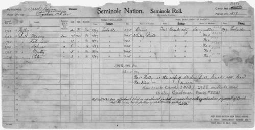 Keywords: Enrollment for Seminole Census Card 519 - NARA - 268093.jpg Scope and content Name Lehman Bull Type By Blood Age 11 Sex Male Degree Indian Blood 1/4 Roll Number 1703 City of Residence e Name Maxey Bull Type By Blood Age 14 Sex Male Degree Indian Blood 1/4 Roll Number 1702 City of Residence e Name Peter Bull Type By Blood Age 3 Sex Male Degree Indian Blood 1/4 Roll Number 1706 City of Residence e Name Sohma Bull Type By Blood Age 8 Sex Male Degree Indian Blood 1/4 Roll Number 1704 City of Residence e Name Waitty Bull Type By Blood Age 5 Sex Male Degree Indian Blood 1/4 Roll Number 1705 City of Residence e Name Wiley Bull Type Parent Sex Male City of Residence Creek Name Nelly Type By Blood Age 40 Sex Female Degree Indian Blood 1/2 Roll Number 1701 City of Residence e Name Senyouille Type Parent Sex Female City of Residence e General notes 268093 Local identifier 75-53A-SEMINOLE 519 Department of the Interior Office of Indian Affairs Office of the Commissioner to the Five Civilized Tribes 1893 - 1914 NARA's Southwest Region Fort Worth NRFA 1400 John Burgess Drive Fort Worth TX 76140 Record group Record Group 75 Records of the Bureau of Indian Affairs 1793 - 1999 Record group ARC 404 Enrollment Cards compiled 1898 - 1914 Series ARC 251747 File unit File unit ARC Variant control numbers NAIL Control Number NRFF-75-53A-26586<br /> NAIL Control Number NRFF-75-53A-26587<br /> NAIL Control Number NRFF-75-53A-26588<br /> NAIL Control Number NRFF-75-53A-26589<br /> NAIL Control Number NRFF-75-53A-26590<br /> NAIL Control Number NRFF-75-53A-26591<br /> NAIL Control Number NRFF-75-53A-43047<br /> NAIL Control Number NRFF-75-53A-46624<br /> NAIL Control Number NRFF-75-53A-SEMINOLE 519 Other versions <gallery> File Enrollment_for_Seminole_Census_Card_519_-_NARA_-_268093 tif tif File Enrollment_for_Seminole_Census_Card_519_-_NARA_-_268093 jpg jpg </gallery> NARA-cooperation PD-USGov Seminole census cards |