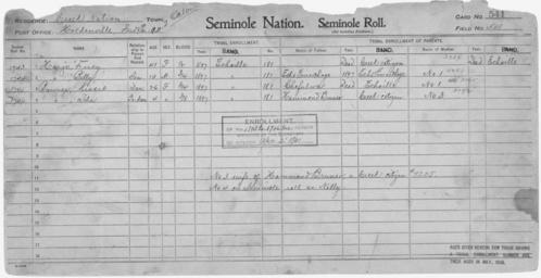 Keywords: Enrollment for Seminole Census Card 541 - NARA - 268115.jpg Scope and content Name Hammond Bruner Type Parent Sex Male City of Residence Creek Name Ida Bruner Type By Blood Age 4 Sex Female Degree Indian Blood 3/8 Roll Number 1746 City of Residence e Name Kissie Bruner Type By Blood Age 26 Sex Female Degree Indian Blood 3/4 Roll Number 1745 City of Residence e Name Chofulwa Type Parent Sex Male City of Residence e Name Echo Emarthoge Type Parent Sex Male City of Residence ee Name Billy Harjo Type By Blood Age 10 Sex Male Degree Indian Blood 3/4 Roll Number 1744 City of Residence e Name Lucy Harjo Type By Blood Age 41 Sex Female Degree Indian Blood 1/2 Roll Number 1743 City of Residence e General notes 268115 Local identifier 75-53A-SEMINOLE 541 Department of the Interior Office of Indian Affairs Office of the Commissioner to the Five Civilized Tribes 1893 - 1914 NARA's Southwest Region Fort Worth NRFA 1400 John Burgess Drive Fort Worth TX 76140 Record group Record Group 75 Records of the Bureau of Indian Affairs 1793 - 1999 Record group ARC 404 Enrollment Cards compiled 1898 - 1914 Series ARC 251747 File unit File unit ARC Variant control numbers NAIL Control Number NRFF-75-53A-26145<br /> NAIL Control Number NRFF-75-53A-26154<br /> NAIL Control Number NRFF-75-53A-26212<br /> NAIL Control Number NRFF-75-53A-27969<br /> NAIL Control Number NRFF-75-53A-30979<br /> NAIL Control Number NRFF-75-53A-34128<br /> NAIL Control Number NRFF-75-53A-34663<br /> NAIL Control Number NRFF-75-53A-SEMINOLE 541 Other versions <gallery> File Enrollment_for_Seminole_Census_Card_541_-_NARA_-_268115 tif tif File Enrollment_for_Seminole_Census_Card_541_-_NARA_-_268115 jpg jpg </gallery> NARA-cooperation PD-USGov Seminole census cards |