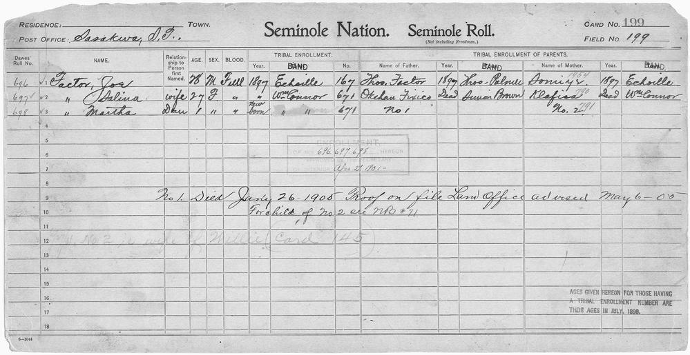 | Keywords: Enrollment for Seminole Census Card 199 - NARA - 267773.tif Scope and content Name Joe Factor Type By Blood Age 28 Sex Male Degree Indian Blood Full Roll Number 696 City of Residence e Name Martha Factor Type By Blood Age 1 Sex Female Degree Indian Blood Full Roll Number 698 City of Residence wc Name Salina Factor Type By Blood Age 27 Sex Female Degree Indian Blood Full Roll Number 697 City of Residence wc Name Thomas Factor Type Parent Sex Male City of Residence tp Name Okchan Fixico Type Parent Sex Male City of Residence sb Name Klafisa Type Parent Sex Female City of Residence wc Name Soniye Type Parent Sex Female City of Residence e General notes 267773 Local identifier 75-53A-SEMINOLE 199 Department of the Interior Office of Indian Affairs Office of the Commissioner to the Five Civilized Tribes 1893 - 1914 NARA's Southwest Region Fort Worth NRFA 1400 John Burgess Drive Fort Worth TX 76140 Record group Record Group 75 Records of the Bureau of Indian Affairs 1793 - 1999 Record group ARC 404 Enrollment Cards compiled 1898 - 1914 Series ARC 251747 File unit File unit ARC Variant control numbers NAIL Control Number NRFF-75-53A-31219<br /> NAIL Control Number NRFF-75-53A-31239<br /> NAIL Control Number NRFF-75-53A-31256<br /> NAIL Control Number NRFF-75-53A-31265<br /> NAIL Control Number NRFF-75-53A-32019<br /> NAIL Control Number NRFF-75-53A-38814<br /> NAIL Control Number NRFF-75-53A-47629<br /> NAIL Control Number NRFF-75-53A-SEMINOLE 199 yes Other versions <gallery> File Enrollment_for_Seminole_Census_Card_199_-_NARA_-_267773 tif tif File Enrollment_for_Seminole_Census_Card_199_-_NARA_-_267773 jpg jpg </gallery> NARA-cooperation PD-USGov Seminole census cards NARA TIF images with categorized JPGs |