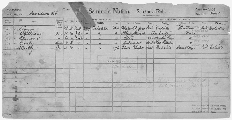 | Keywords: Enrollment for Seminole Census Card 224 - NARA - 267798.jpg Scope and content Name Ahala Chupco Type Parent Sex Male City of Residence e Name Cindy Type By Blood Age 3 Sex Female Degree Indian Blood Full Roll Number 763 City of Residence e Name Edmond Type By Blood Age 6 Sex Male Degree Indian Blood Full Roll Number 762 City of Residence e Name Itey Type Parent Sex Male City of Residence th Name Lizzie Type By Blood Age 28 Sex Female Degree Indian Blood Full Roll Number 760 City of Residence e Name Salma Type Parent Sex Male City of Residence tp Name Sanotsey Type Parent Sex Female City of Residence e Name Albert Stewart Type Parent Sex Male City of Residence Creek Name Weely Type By Blood Age 13 Sex Male Degree Indian Blood Full Roll Number 764 City of Residence e Name William Type By Blood Age 10 Sex Male Degree Indian Blood 1/2 Roll Number 761 City of Residence e General notes 267798 Local identifier 75-53A-SEMINOLE 224 Department of the Interior Office of Indian Affairs Office of the Commissioner to the Five Civilized Tribes 1893 - 1914 NARA's Southwest Region Fort Worth NRFA 1400 John Burgess Drive Fort Worth TX 76140 Record group Record Group 75 Records of the Bureau of Indian Affairs 1793 - 1999 Record group ARC 404 Enrollment Cards compiled 1898 - 1914 Series ARC 251747 File unit File unit ARC Variant control numbers NAIL Control Number NRFF-75-53A-28051<br /> NAIL Control Number NRFF-75-53A-28235<br /> NAIL Control Number NRFF-75-53A-30773<br /> NAIL Control Number NRFF-75-53A-37222<br /> NAIL Control Number NRFF-75-53A-39656<br /> NAIL Control Number NRFF-75-53A-45632<br /> NAIL Control Number NRFF-75-53A-45870<br /> NAIL Control Number NRFF-75-53A-47969<br /> NAIL Control Number NRFF-75-53A-50941<br /> NAIL Control Number NRFF-75-53A-51339<br /> NAIL Control Number NRFF-75-53A-SEMINOLE 224 Other versions <gallery> File Enrollment_for_Seminole_Census_Card_224_-_NARA_-_267798 tif tif File Enrollment_for_Seminole_Census_Card_224_-_NARA_-_267798 jpg jpg </gallery> NARA-cooperation PD-USGov Seminole census cards |