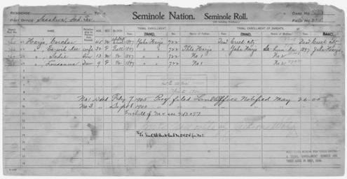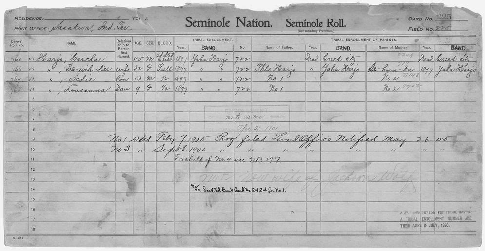| Keywords: Enrollment for Seminole Census Card 225 - NARA - 267799.tif Scope and content Name Carchar Harjo Type By Blood Age 45 Sex Male Degree Indian Blood AC Roll Number 765 City of Residence yh Name Euwihkee Harjo Type By Blood Age 32 Sex Female Degree Indian Blood Full Roll Number 766 City of Residence yh Name Lousanna Harjo Type By Blood Age 9 Sex Female Degree Indian Blood 1/2 Roll Number 768 City of Residence yh Name Sadie Harjo Type By Blood Age 13 Sex Male Degree Indian Blood 1/2 Roll Number 767 City of Residence yh Name Thle Harjo Type Parent Sex Male City of Residence yh Name Sehunka Type Parent Sex Female City of Residence yh General notes 267799 Local identifier 75-53A-SEMINOLE 225 Department of the Interior Office of Indian Affairs Office of the Commissioner to the Five Civilized Tribes 1893 - 1914 NARA's Southwest Region Fort Worth NRFA 1400 John Burgess Drive Fort Worth TX 76140 Record group Record Group 75 Records of the Bureau of Indian Affairs 1793 - 1999 Record group ARC 404 Enrollment Cards compiled 1898 - 1914 Series ARC 251747 File unit File unit ARC Variant control numbers NAIL Control Number NRFF-75-53A-34143<br /> NAIL Control Number NRFF-75-53A-34323<br /> NAIL Control Number NRFF-75-53A-34641<br /> NAIL Control Number NRFF-75-53A-35014<br /> NAIL Control Number NRFF-75-53A-35124<br /> NAIL Control Number NRFF-75-53A-46449<br /> NAIL Control Number NRFF-75-53A-SEMINOLE 225 yes Other versions <gallery> File Enrollment_for_Seminole_Census_Card_225_-_NARA_-_267799 tif tif File Enrollment_for_Seminole_Census_Card_225_-_NARA_-_267799 jpg jpg </gallery> NARA-cooperation PD-USGov Seminole census cards NARA TIF images with categorized JPGs |