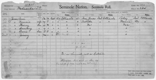 Keywords: Enrollment for Seminole Census Card 234 - NARA - 267808.tif Scope and content Name Annie Jones Type By Blood Age 5 Sex Female Degree Indian Blood Full Roll Number 791 City of Residence o Name Harry Jones Type By Blood Age 10 Sex Male Degree Indian Blood Full Roll Number 789 City of Residence o Name Isaac Jones Type By Blood Age 32 Sex Male Degree Indian Blood Full Roll Number 787 City of Residence o Name Joiney Jones Type By Blood Age 1 Sex Female Degree Indian Blood Full City of Residence o Name Nannie Jones Type By Blood Age 29 Sex Female Degree Indian Blood Full Roll Number 788 City of Residence o Name Sammy Jones Type By Blood Age 7 Sex Male Degree Indian Blood Full Roll Number 790 City of Residence o Name Tom Jones Type Parent Sex Male City of Residence o Name Lodey Type Parent Sex Female City of Residence o Name Manna Type Parent Sex Female City of Residence o Name Tewetke Type Parent Sex Male City of Residence o General notes 267808 Local identifier 75-53A-SEMINOLE 234 Department of the Interior Office of Indian Affairs Office of the Commissioner to the Five Civilized Tribes 1893 - 1914 NARA's Southwest Region Fort Worth NRFA 1400 John Burgess Drive Fort Worth TX 76140 Record group Record Group 75 Records of the Bureau of Indian Affairs 1793 - 1999 Record group ARC 404 Enrollment Cards compiled 1898 - 1914 Series ARC 251747 File unit File unit ARC Variant control numbers NAIL Control Number NRFF-75-53A-38030<br /> NAIL Control Number NRFF-75-53A-38067<br /> NAIL Control Number NRFF-75-53A-38069<br /> NAIL Control Number NRFF-75-53A-38077<br /> NAIL Control Number NRFF-75-53A-38117<br /> NAIL Control Number NRFF-75-53A-38130<br /> NAIL Control Number NRFF-75-53A-38141<br /> NAIL Control Number NRFF-75-53A-39669<br /> NAIL Control Number NRFF-75-53A-40439<br /> NAIL Control Number NRFF-75-53A-48917<br /> NAIL Control Number NRFF-75-53A-SEMINOLE 234 yes Other versions <gallery> File Enrollment_for_Seminole_Census_Card_234_-_NARA_-_267808 tif tif File Enrollment_for_Seminole_Census_Card_234_-_NARA_-_267808 jpg jpg </gallery> NARA-cooperation PD-USGov Seminole census cards NARA TIF images with categorized JPGs |