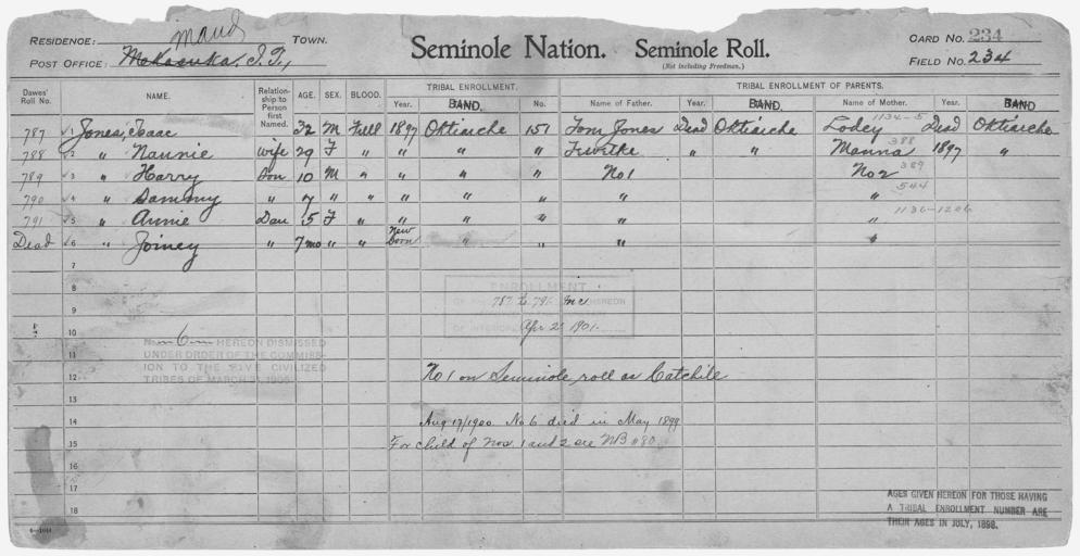 Keywords: Enrollment for Seminole Census Card 234 - NARA - 267808.jpg Scope and content Name Annie Jones Type By Blood Age 5 Sex Female Degree Indian Blood Full Roll Number 791 City of Residence o Name Harry Jones Type By Blood Age 10 Sex Male Degree Indian Blood Full Roll Number 789 City of Residence o Name Isaac Jones Type By Blood Age 32 Sex Male Degree Indian Blood Full Roll Number 787 City of Residence o Name Joiney Jones Type By Blood Age 1 Sex Female Degree Indian Blood Full City of Residence o Name Nannie Jones Type By Blood Age 29 Sex Female Degree Indian Blood Full Roll Number 788 City of Residence o Name Sammy Jones Type By Blood Age 7 Sex Male Degree Indian Blood Full Roll Number 790 City of Residence o Name Tom Jones Type Parent Sex Male City of Residence o Name Lodey Type Parent Sex Female City of Residence o Name Manna Type Parent Sex Female City of Residence o Name Tewetke Type Parent Sex Male City of Residence o General notes 267808 Local identifier 75-53A-SEMINOLE 234 Department of the Interior Office of Indian Affairs Office of the Commissioner to the Five Civilized Tribes 1893 - 1914 NARA's Southwest Region Fort Worth NRFA 1400 John Burgess Drive Fort Worth TX 76140 Record group Record Group 75 Records of the Bureau of Indian Affairs 1793 - 1999 Record group ARC 404 Enrollment Cards compiled 1898 - 1914 Series ARC 251747 File unit File unit ARC Variant control numbers NAIL Control Number NRFF-75-53A-38030<br /> NAIL Control Number NRFF-75-53A-38067<br /> NAIL Control Number NRFF-75-53A-38069<br /> NAIL Control Number NRFF-75-53A-38077<br /> NAIL Control Number NRFF-75-53A-38117<br /> NAIL Control Number NRFF-75-53A-38130<br /> NAIL Control Number NRFF-75-53A-38141<br /> NAIL Control Number NRFF-75-53A-39669<br /> NAIL Control Number NRFF-75-53A-40439<br /> NAIL Control Number NRFF-75-53A-48917<br /> NAIL Control Number NRFF-75-53A-SEMINOLE 234 Other versions <gallery> File Enrollment_for_Seminole_Census_Card_234_-_NARA_-_267808 tif tif File Enrollment_for_Seminole_Census_Card_234_-_NARA_-_267808 jpg jpg </gallery> NARA-cooperation PD-USGov Seminole census cards |