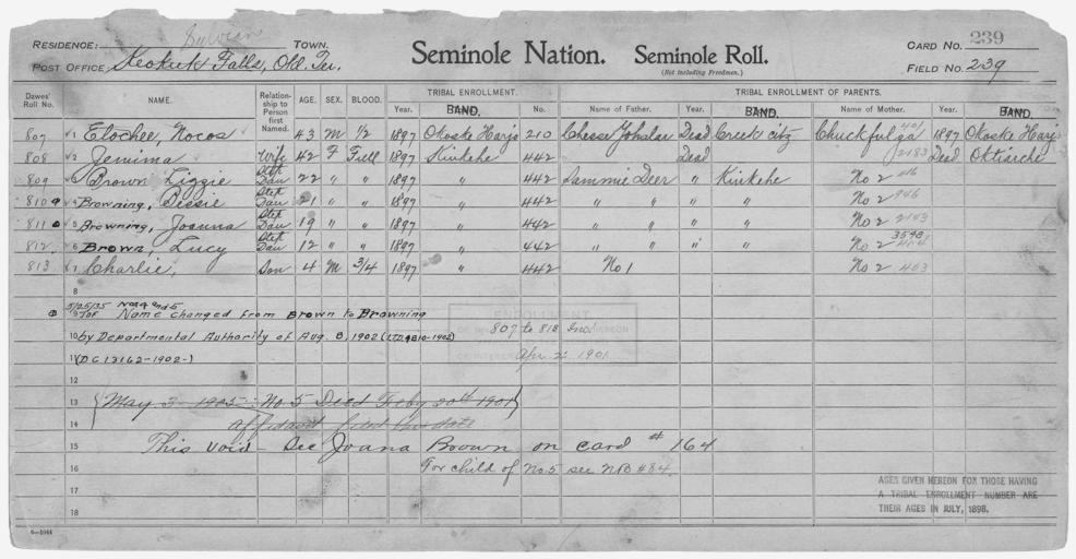 Keywords: Enrollment for Seminole Census Card 239 - NARA - 267813.jpg Scope and content Name Lizzie Brown Type By Blood Age 22 Sex Female Degree Indian Blood Full Roll Number 809 City of Residence k Name Lucy Brown Type By Blood Age 12 Sex Female Degree Indian Blood Full Roll Number 812 City of Residence k Name Bessie Browning Type By Blood Age 21 Sex Female Degree Indian Blood Full Roll Number 810 City of Residence k Name Joanna Browning Type By Blood Age 19 Sex Female Degree Indian Blood Full Roll Number 811 City of Residence k Name Charlie Type By Blood Age 4 Sex Male Degree Indian Blood 3/4 Roll Number 813 City of Residence k Name Chuckfulga Type Parent Sex Female City of Residence oh Name Sammie Deer Type Parent Sex Male City of Residence k Name Nocus Etochee Type By Blood Age 43 Sex Male Degree Indian Blood 1/2 Roll Number 807 City of Residence oh Name Jemima Type By Blood Age 42 Sex Female Degree Indian Blood Full Roll Number 808 City of Residence k Name Chesse Yohalar Type Parent Sex Male City of Residence Creek General notes 267813 Local identifier 75-53A-SEMINOLE 239 Department of the Interior Office of Indian Affairs Office of the Commissioner to the Five Civilized Tribes 1893 - 1914 NARA's Southwest Region Fort Worth NRFA 1400 John Burgess Drive Fort Worth TX 76140 Record group Record Group 75 Records of the Bureau of Indian Affairs 1793 - 1999 Record group ARC 404 Enrollment Cards compiled 1898 - 1914 Series ARC 251747 File unit File unit ARC Variant control numbers NAIL Control Number NRFF-75-53A-25853<br /> NAIL Control Number NRFF-75-53A-25868<br /> NAIL Control Number NRFF-75-53A-25995<br /> NAIL Control Number NRFF-75-53A-25996<br /> NAIL Control Number NRFF-75-53A-27480<br /> NAIL Control Number NRFF-75-53A-28025<br /> NAIL Control Number NRFF-75-53A-30155<br /> NAIL Control Number NRFF-75-53A-31091<br /> NAIL Control Number NRFF-75-53A-37528<br /> NAIL Control Number NRFF-75-53A-52576<br /> NAIL Control Number NRFF-75-53A-SEMINOLE 239 Other versions <gallery> File Enrollment_for_Seminole_Census_Card_239_-_NARA_-_267813 tif tif File Enrollment_for_Seminole_Census_Card_239_-_NARA_-_267813 jpg jpg </gallery> NARA-cooperation PD-USGov Seminole census cards |