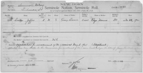 Keywords: Enrollment for Seminole Census Card 89 - NARA - 267663.tif Scope and content Name Afingy Type Parent Sex Male City of Residence th Name Cheparny Type By Blood Age 3 Sex Male Degree Indian Blood Full Roll Number 313 City of Residence th Name Jim Harjo Type Parent Sex Male City of Residence tp Name Liddia Type Parent Sex Female City of Residence th Name Mollie Type By Blood Age 30 Sex Female Degree Indian Blood Full Roll Number 311 City of Residence th Name Phena Type By Blood Age 5 Sex Female Degree Indian Blood Full Roll Number 312 City of Residence th Name Jeffie Brown Type Newborn Age 3 Sex Male Degree Indian Blood 1/2 Roll Number 208 Post Office Tidmore Name Gracie Davis Type Newborn Freedmen-Rejected Age 3 Sex Female Degree Indian Blood Not Reported Roll Number 93 Post Office Wewoka General notes 267663 Local identifier 75-53A-SEMINOLE 89 Department of the Interior Office of Indian Affairs Office of the Commissioner to the Five Civilized Tribes 1893 - 1914 NARA's Southwest Region Fort Worth NRFA 1400 John Burgess Drive Fort Worth TX 76140 Record group Record Group 75 Records of the Bureau of Indian Affairs 1793 - 1999 Record group ARC 404 Enrollment Cards compiled 1898 - 1914 Series ARC 251747 File unit File unit ARC Variant control numbers NAIL Control Number NRFF-75-53A-22776<br /> NAIL Control Number NRFF-75-53A-27605<br /> NAIL Control Number NRFF-75-53A-34484<br /> NAIL Control Number NRFF-75-53A-39447<br /> NAIL Control Number NRFF-75-53A-42384<br /> NAIL Control Number NRFF-75-53A-44057<br /> NAIL Control Number NRFF-75-53A-52651<br /> NAIL Control Number NRFF-75-53A-52936<br /> NAIL Control Number NRFF-75-53A-SEMINOLE 89 yes Other versions <gallery> File Enrollment_for_Seminole_Census_Card_89_-_NARA_-_267663 tif tif File Enrollment_for_Seminole_Census_Card_89_-_NARA_-_267663 jpg jpg </gallery> NARA-cooperation PD-USGov Cherokee census cards NARA TIF images with categorized JPGs |