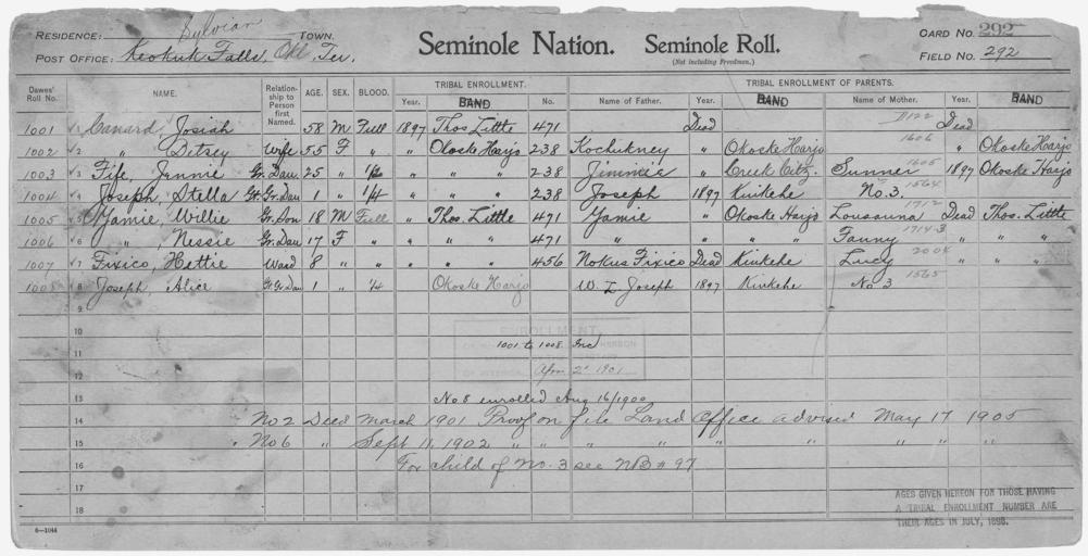 | Keywords: Enrollment for Seminole Census Card 292 - NARA - 267866.jpg Scope and content Name Betsey Canard Type By Blood Age 55 Sex Female Degree Indian Blood Full Roll Number 1002 City of Residence oh Name Josiah Canard Type By Blood Age 58 Sex Male Degree Indian Blood Full Roll Number 1001 City of Residence tl Name Jennie Fife Type By Blood Age 25 Sex Female Degree Indian Blood 1/2 Roll Number 1003 City of Residence oh Name Hettie Fixico Type By Blood Age 8 Sex Female Degree Indian Blood Full Roll Number 1007 City of Residence tl Name Nokus Fixico Type Parent Sex Male City of Residence k Name Stella Hoseph Type By Blood Age 1 Sex Female Degree Indian Blood 1/4 Roll Number 1004 City of Residence oh Name Alice Joseph Type By Blood Age 1 Sex Female Degree Indian Blood 1/4 Roll Number 1008 City of Residence oh Name W L Joseph Type Parent Sex Male City of Residence k Name Kochukney Type Parent Sex Male City of Residence oh Name Lousanna Type Parent Sex Female City of Residence oh Name Nessie Yamie Type By Blood Age 17 Sex Female Degree Indian Blood Full Roll Number 1006 City of Residence tl Name Willie Yamie Type By Blood Age 18 Sex Male Degree Indian Blood Full Roll Number 1005 City of Residence tl General notes 267866 Local identifier 75-53A-SEMINOLE 292 Department of the Interior Office of Indian Affairs Office of the Commissioner to the Five Civilized Tribes 1893 - 1914 NARA's Southwest Region Fort Worth NRFA 1400 John Burgess Drive Fort Worth TX 76140 Record group Record Group 75 Records of the Bureau of Indian Affairs 1793 - 1999 Record group ARC 404 Enrollment Cards compiled 1898 - 1914 Series ARC 251747 File unit File unit ARC Variant control numbers NAIL Control Number NRFF-75-53A-26998<br /> NAIL Control Number NRFF-75-53A-27021<br /> NAIL Control Number NRFF-75-53A-31484<br /> NAIL Control Number NRFF-75-53A-31908<br /> NAIL Control Number NRFF-75-53A-32014<br /> NAIL Control Number NRFF-75-53A-36755<br /> NAIL Control Number NRFF-75-53A-38162<br /> NAIL Control Number NRFF-75-53A-38177<br /> NAIL Control Number NRFF-75-53A-38883<br /> NAIL Control Number NRFF-75-53A-39945<br /> NAIL Control Number NRFF-75-53A-52355<br /> NAIL Control Number NRFF-75-53A-52356<br /> NAIL Control Number NRFF-75-53A-SEMINOLE 292 Other versions <gallery> File Enrollment_for_Seminole_Census_Card_292_-_NARA_-_267866 tif tif File Enrollment_for_Seminole_Census_Card_292_-_NARA_-_267866 jpg jpg </gallery> NARA-cooperation PD-USGov Seminole census cards |