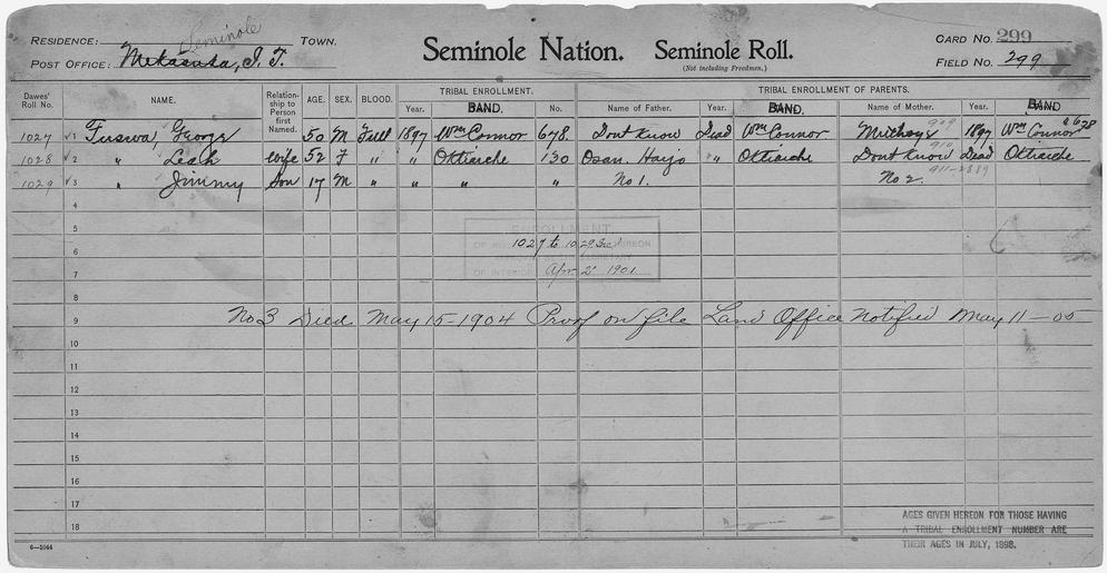 | Keywords: Enrollment for Seminole Census Card 299 - NARA - 267873.tif Scope and content Name George Fuswa Type By Blood Age 50 Sex Male Degree Indian Blood Full Roll Number 1027 City of Residence wc Name Jimmy Fuswa Type By Blood Age 17 Sex Male Degree Indian Blood Full Roll Number 1029 City of Residence o Name Leah Fuswa Type By Blood Age 52 Sex Female Degree Indian Blood Full Roll Number 1028 City of Residence o Name Osan Harjo Type Parent Sex Male City of Residence o Name Muthoy Type Parent Sex Female City of Residence wc General notes 267873 Local identifier 75-53A-SEMINOLE 299 Department of the Interior Office of Indian Affairs Office of the Commissioner to the Five Civilized Tribes 1893 - 1914 NARA's Southwest Region Fort Worth NRFA 1400 John Burgess Drive Fort Worth TX 76140 Record group Record Group 75 Records of the Bureau of Indian Affairs 1793 - 1999 Record group ARC 404 Enrollment Cards compiled 1898 - 1914 Series ARC 251747 File unit File unit ARC Variant control numbers NAIL Control Number NRFF-75-53A-32765<br /> NAIL Control Number NRFF-75-53A-32766<br /> NAIL Control Number NRFF-75-53A-32768<br /> NAIL Control Number NRFF-75-53A-34917<br /> NAIL Control Number NRFF-75-53A-42873<br /> NAIL Control Number NRFF-75-53A-SEMINOLE 299 yes Other versions <gallery> File Enrollment_for_Seminole_Census_Card_299_-_NARA_-_267873 tif tif File Enrollment_for_Seminole_Census_Card_299_-_NARA_-_267873 jpg jpg </gallery> NARA-cooperation PD-USGov Seminole census cards NARA TIF images with categorized JPGs |