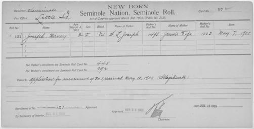 | Keywords: Enrollment for Seminole Census Card 97 - NARA - 267671.tif Scope and content Name Hoktoke Type By Blood Age 14 Sex Female Degree Indian Blood Full Roll Number 341 City of Residence tp Name Itchkanaaha Type Parent Sex Female City of Residence tp Name Jannie Type By Blood Age 55 Sex Female Degree Indian Blood Full Roll Number 339 City of Residence o Name Josey Type By Blood Age 8 Sex Male Degree Indian Blood Full Roll Number 342 City of Residence tp Name Ponnokee Type By Blood Age 45 Sex Male Degree Indian Blood Full Roll Number 338 City of Residence th Name Sefah Type By Blood Age 18 Sex Male Degree Indian Blood Full Roll Number 340 City of Residence tp Name Maney Joseph Type Newborn Age 3 Sex Female Degree Indian Blood 3/4 Roll Number 121 Post Office Little General notes 267671 Local identifier 75-53A-SEMINOLE 97 Department of the Interior Office of Indian Affairs Office of the Commissioner to the Five Civilized Tribes 1893 - 1914 NARA's Southwest Region Fort Worth NRFA 1400 John Burgess Drive Fort Worth TX 76140 Record group Record Group 75 Records of the Bureau of Indian Affairs 1793 - 1999 Record group ARC 404 Enrollment Cards compiled 1898 - 1914 Series ARC 251747 File unit File unit ARC Variant control numbers NAIL Control Number NRFF-75-53A-36520<br /> NAIL Control Number NRFF-75-53A-37219<br /> NAIL Control Number NRFF-75-53A-37472<br /> NAIL Control Number NRFF-75-53A-38180<br /> NAIL Control Number NRFF-75-53A-44358<br /> NAIL Control Number NRFF-75-53A-46434<br /> NAIL Control Number NRFF-75-53A-52663<br /> NAIL Control Number NRFF-75-53A-SEMINOLE 97 yes Other versions <gallery> File Enrollment_for_Seminole_Census_Card_97_-_NARA_-_267671 tif tif File Enrollment_for_Seminole_Census_Card_97_-_NARA_-_267671 jpg jpg </gallery> NARA-cooperation PD-USGov Cherokee census cards NARA TIF images with categorized JPGs |