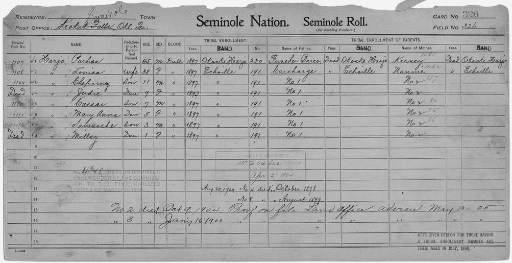 | Keywords: Enrollment for Seminole Census Card 326 - NARA - 267900.tif Scope and content Name Fusecher Barco Type Parent Sex Male City of Residence oh Name Carcharge Type Parent Sex Male City of Residence e Name Caesar Harjo Type By Blood Age 7 Sex Male Degree Indian Blood Full Roll Number 1110 City of Residence e Name Cheparney Harjo Type By Blood Age 11 Sex Male Degree Indian Blood Full Roll Number 1109 City of Residence e Name Judie Harjo Type By Blood Age 9 Sex Female Degree Indian Blood Full City of Residence e Name Louisa Harjo Type By Blood Age 38 Sex Female Degree Indian Blood Full Roll Number 1108 City of Residence e Name Mary Anna Harjo Type By Blood Age 5 Sex Female Degree Indian Blood Full Roll Number 1111 City of Residence e Name Millsy Harjo Type By Blood Age 1 Sex Female Degree Indian Blood Full City of Residence e Name Parhos Harjo Type By Blood Age 45 Sex Male Degree Indian Blood Full Roll Number 1107 City of Residence oh Name Samsoche Harjo Type By Blood Age 3 Sex Male Degree Indian Blood Full Roll Number 1112 City of Residence e Name Kersey Type Parent Sex Female City of Residence oh Name Nannie Type Parent Sex Female City of Residence e General notes 267900 Local identifier 75-53A-SEMINOLE 326 Department of the Interior Office of Indian Affairs Office of the Commissioner to the Five Civilized Tribes 1893 - 1914 NARA's Southwest Region Fort Worth NRFA 1400 John Burgess Drive Fort Worth TX 76140 Record group Record Group 75 Records of the Bureau of Indian Affairs 1793 - 1999 Record group ARC 404 Enrollment Cards compiled 1898 - 1914 Series ARC 251747 File unit File unit ARC Variant control numbers NAIL Control Number NRFF-75-53A-23730<br /> NAIL Control Number NRFF-75-53A-27118<br /> NAIL Control Number NRFF-75-53A-34135<br /> NAIL Control Number NRFF-75-53A-34174<br /> NAIL Control Number NRFF-75-53A-34529<br /> NAIL Control Number NRFF-75-53A-34638<br /> NAIL Control Number NRFF-75-53A-34713<br /> NAIL Control Number NRFF-75-53A-34752<br /> NAIL Control Number NRFF-75-53A-34946<br /> NAIL Control Number NRFF-75-53A-35026<br /> NAIL Control Number NRFF-75-53A-38586<br /> NAIL Control Number NRFF-75-53A-42951<br /> NAIL Control Number NRFF-75-53A-SEMINOLE 326 yes Other versions <gallery> File Enrollment_for_Seminole_Census_Card_326_-_NARA_-_267900 tif tif File Enrollment_for_Seminole_Census_Card_326_-_NARA_-_267900 jpg jpg </gallery> NARA-cooperation PD-USGov Seminole census cards NARA TIF images with categorized JPGs |