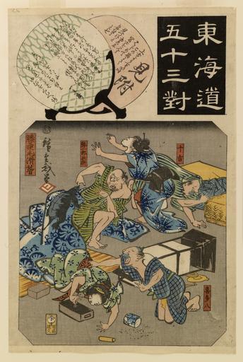 Keywords: Enshuya Matabei - Tokaido gojusan tsui - Walters 95571.jpg In this print everything goes topsy-turvy as people run into each other trying to escape from a snapping turtle This print illustrates a scene from the comic novel Footing It along the Tokaido Road or Shank's Mare by Jippensha Ikku 1765-1831 The main characters are Yaji and Kita two happy-go-lucky travelers who experience many adventures as they go along the road between Edo Tokyo and Kyoto The 53 stations of the Tokaido in pairs ca 1845 1846 late Edo pigments mulberry paper cm 36 83 24 45 accession number 95 571 36836 Justine Lewis Keidel date and mode of acquisition unknown Walters Art Museum Gift of Justine Lewis Keidel 1991 Signature Hiroshige giga; Transcription Hizakurige kokkei; Translation Hizakurige Humor place of origin Japan http //www kunisada de/Kunisada-Tokaido-Series/parallels/Tokaido-parallels1 20 htm p29 Kunisada Project Series Tōkaidō gojūsan tsui Walters Art Museum license 2D Japanese prints in the Walters Art Museum Historic samurai prints Media contributed by the Walters Art Museum needs category review The 53 stations of the Tokaido in pairs |