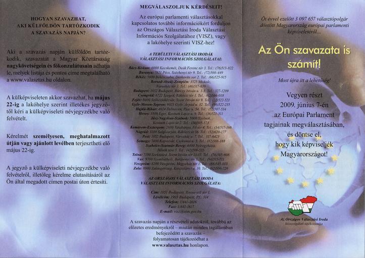 Keywords: EP election 2009 in Hungary, Voter invitation card, face 1.jpg European Parliament election of 2009 Frontpage This card has been delievered alongside with a proposal coupon in Hungarian kopogtatócédula or ajánlószelvény and a voter registration card for registered voters via letter Color 300 dpi Hardware Epson Perfection v10 Translation Page 1 How can you vote if you are overseas by the time of the election Those who are overseas while the election is in progress can vote through the Republic of Hungary's consulates and embassies of which addresses can be found on www valasztas hu Only those are able to vote through a foreign representation who request their enrolment on the foreign representation voters ™ list from the local notary public in the district of his/her residence until 22 May 2009 Such a request can be done personally or by a designated representative or via registered mail The notary public will respond via mail on your request's approval or rejection Page 2 Let us answer your questions If you need further information about the European Parliament election do not hesitate to visit the Information Service of the National Election Office or your local Information Service in your district Addresses of local Information Services Information on the participation will be available on www valasztas hu on the date of election Results will be hold back until the voting process ends in all of the countries Page 3 Five years ago 3 097 657 voters decided about Hungary's EP delegation Your vote counts too Now here is your chance Participate in the upcoming EP election on 7th June 2009 and decide about who will represent Hungary - prospectus by the National Election Office hu Az Országos Választási Iroda szóróanyaga a 2009 évi európai parlamenti választásokhoz Címlap A választási névjegyzékre felvettek kapták kézhez az ajánlószelvénnyel és a névjegyzéki értesítÅ‘vel együtt Színes 300 dpi Szkenner Epson Perfection v10 Az eredeti szöveg 1 oldal žHogyan szavazhat aki külföldön tartózkodik a szavazás napján Aki a szavazás napján külföldön tartózkodik szavazatát a Magyar Köztársaság nagykövetségein és fÅ‘konzulátusain adhatja le melyek listája és pontos címe megtalálható a www valasztas hu oldalon A külképviseleten akkor szavazhat ha május 22-ig a lakóhelye szerint illetékes jegyzÅ‘tÅ‘l kéri a külképviseleti névjegyzékbe való felvételt Kérelmét személyesen meghatalmazott útján vagy ajánlott levélben terjesztheti elÅ‘ május 22-ig A jegyzÅ‘ a külképviseleti névjegyzékbe való felvételrÅ‘l illetÅ‘leg kérelme elutasításáról az Ön által megadott címen postai úton értesíti 2 oldal žMegválaszoljuk kérdéseit Az európai parlamenti választásokkal kapcsolatos további információkért forduljon az Országos Választási Iroda Választási Információs Szolgálatához VISZ vagy a lakóhelye szerinti VISZ-hez A területi választási irodák választási információs szolgálatai A szavazás napján a résztvételi adatokról továbbá az elÅ‘zetes eredméyekrÅ‘l - miután minden tagállamban befejezÅ‘dött a szavazás - folyamatosan tájékozódhat a www valasztas hu honlapon 3 oldal žÃ–t évvel ezelÅ‘tt 3 097 657 választópolgár döntött Magyarország európai parlamenti képviseletérÅ‘l Az Ön szavazata is számít Most újra itt a lehetÅ‘ség Vegyen részt 2009 június 7-én az európai Parlament tagjainak megválasztásában és döntse el hogy kik képviseljék Magyarországot - Az Országos Választási Iroda közszolgálati tájékoztatója en Scanned by the uploader hu Saját szkennelés Hungary hu A szerzÅ‘ ismeretlen Közreadó http //www valasztas hu/ Az Országos Választási Iroda Publication 2009 PD-HU-exempt thumb 100px Frontpage only / Címlap Voter invitation cards European Parliament election 2009 Hungary