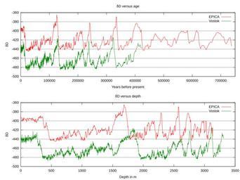 | Keywords: EPICA delta D plot.svg Plots of delta-deuterium against age and depth from EPICA and Vostok Note that the Vostok core is deeper but does not extend as far back in time Note also that the y-axis offset between the EPICA and Vostok cores in delta-deuterium is real Vostok is a colder site hence has more negative delta Differences in the apparent age of events are likely to be inaccuracies in converting ice depth to age Epica_18_plot png 2010-06-20 12 20 UTC Epica_18_plot png NOAA derivative work Autopilot <span class signature-talk >talk</span> gnuplot Generated as svg Epica_18_plot png Data sets from ftp //ftp ncdc noaa gov/pub/data/paleo/icecore/antarctica/epica_domec/edc_dd txt ftp //ftp ncdc noaa gov/pub/data/paleo/icecore/antarctica/vostok/deutnat txt Generated with gnuplot <pre> unset multiplot set term svg size 1024 768 set output epica-18 svg set grid y set multiplot layout 2 1 set ylabel δD set title δD versus age set xlabel Years before present plot 0 750000 \ epica txt using 3 6 title EPICA with lines \ vostok txt using 2 3 title Vostok with lines set title δD versus depth set xlabel Depth in m plot \ epica txt using 1 6 title EPICA with lines \ vostok txt using 1 3 title Vostok with lines </pre> PD-USGov original upload log This image is a derivative work of the following images File Epica_18_plot png licensed with PD-USGov 2008-05-24T15 30 59Z Rosarinagazo 596x417 11279 Bytes <nowiki> Plots of delta-deuterium against age and depth from EPICA and Vostok Note that the Vostok core is deeper but does not extend as far back in time Note also that the y-axis offset between the EPI</nowiki> Uploaded with derivativeFX Climatological diagrams Deuterium Glaciers of Antarctica Glaciological diagrams Neogene |