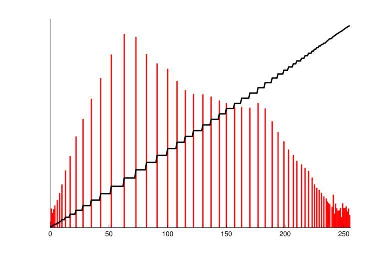 Keywords: Equalized Histogram.svg Greyscale frequency histogram of Equalized Hawkes Bay NZ jpg X-axis shows image intensity y-axis number of pixels with that intensity Black curve shows cumulative histogram self-made based on Image Equalized Histogram gif file by Konstable 2008-04 Jarekt unrestricted use Created with MATLAB The image was generated using the following MATLAB code with help of external library http //www mathworks com/matlabcentral/fileexchange/loadFile do objectId 7401 objectType file plot2svc <source lang matlab > I rgb2gray imread 'Unequalized_Hawkes_Bay_NZ jpg' ; h hist double I 0 255 ; map cumsum h /prod size I ; J 255 map I+1 ; h x hist double J 0 255 ; map cumsum h /prod size J ; figure 1 hold on bar x h 'r' ; plot x 30000 map 'k' xlim 0 256 ; ylim 0 31000 ; plot2svg 'Equalized Histogram svg' </source> Image processing histograms Plots by Jarek Tuszynski Images with Matlab source code