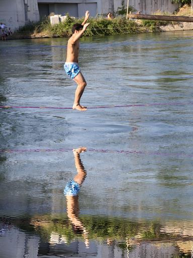 Keywords: equlibrista naviglio acrobat guy jump walk line lake sport