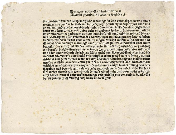 Keywords: Ernst und Albrecht von Sachsen Ausschreibung 1485.jpg Ernst von Sachen und Albrecht von Sachsen Ausschreibung die Vorbereitung zu einem Kriegszug betreffend Formular für Städte Einblattdruck 1 S Zwickau 17 III 1485 Gedruckt Leipzig Conrad Kachelofen 1485 GW 9387 http //www bassenge com/ Galerie Bassenge 1485 Printer Conrad Kachelofen PD-old-100 Images from Galerie Bassenge 1485 documents Incunabula Ernest Elector of Saxony Albert III Duke of Saxony Konrad Kachelofen |
