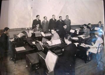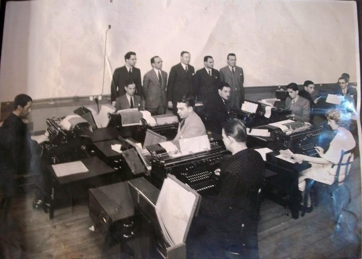 Keywords: Escritório Matarazzo.jpg Escritório do Conde Matarazzo por volta de 1930 Em pé estão Salvador Graciano Cappellano contador seu concunhado Luís Lulu Coccozza advogado e outros own ~ 1930 original photo / Luiz Carlos Cappellano repro Black and white photographs People with typewriters People of Brazil 1930 photographs PD-old |