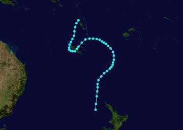 Keywords: Eseta 1988 track.png Track map of Tropical Cyclone Eseta of the 1988 89 South Pacific cyclone season The points show the location of the storm at 6-hour intervals The colour represents the storm's maximum sustained wind speeds as classified in the Saffir-Simpson Hurricane Scale see below and the shape of the data points represent the nature of the storm according to the legend below clear User Nilfanion/Tc/T Created by Iune using Wikipedia WikiProject Tropical cyclones/Tracks The background image is from NASA Tracking data is from the FMS 2010-11-26 Iune cc-by-sa-3 0 GFDL 1988-89 South Pacific cyclone season track maps |
