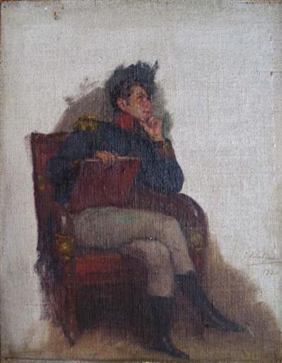 Keywords: Estudo de figuras humanas para a tela Cortes Constituintes de 1821 (Matias José Dias Azedo) - Veloso Salgado, 1920.png en Estudo de figuras humanas para a tela Cortes Constituintes de 1821 de Veloso Salgado A personagem representada é Matias José Dias Azedo uma figura de homem adulto de cabelo escuro curto e ondulado rosto glabro sentado numa cadeira forrada de veludo vermelho com ornatos dourados nos braços de frente para o espectador voltado a três quartos para a direita apoiando a cabeça na mão esquerda e segurando um livro na mão direita com as pernas cruzadas vestindo farda de general casaco azul ultramarino com divisas douradas calças claras e botas pretas de cano alto Assinado e datado V Salgado 1920 pt Study of human figures for the painting The Constituent Courts of 1821 by Veloso Salgado The depicted individual is Matias José Dias Azedo an adult man with dark short wavy hair shaven face sitting on a chair with red velvet upholstery facing the spectator turned three-quarters to the right holding his head on his left hand and holding a book on his right hand with crossed legs and wearing a general's uniform deep blue coat golden trimming light trousers and black boots Signed and dated V Salgado 1920 1920 http //museu parlamento pt/MatrizWebAR/Objectos/ObjectosConsultar aspx IdReg 509 EntSep 5 MatrizPix - Museu da Assembleia da República Creator Veloso Salgado other versions Custom license marker 2016 10 30 PD-old-70 Matias José Dias Azedo Studies for As Cortes Constituintes de 1821 Veloso Salgado |