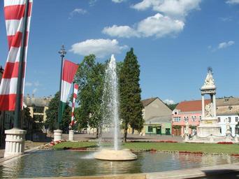 Keywords: Esztergom-Széchenyi square fountain, flags.JPG The main square of Esztergom Own 2007 Villy Széchenyi square Esztergom Fountains in Komárom-Esztergom County