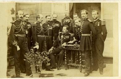 | Keywords: État-major du corps d'occupation en Italie (1863).jpg author État-major du corps d'occupation en Italie 1863 cm Institution Les officiers du corps d'armée d'occupation de Rome - 1863 L'armée française déploie un corps d'occupation à Rome pour protéger les possessions du Pape Ces troupes sont présentes de 1849 à 1870 sous diverses appellations corps d'armée d'occupation division d'occupation En 1863 le corps d'occupation est réduit à une seule division de trois brigade et un régiment de cavalerie 4e régiment de hussards C'est le général de Montebello qui commande les troupes Il est photographié ici à Rome entouré de ses officers d'état major en grande tenue L'état major du Corps d'armée Commandant la division Général de Montebello Chef d'état-major Colonel Pissis Membres de l'état-major Chef d'escadron de la Haye Chef d'escadron Sumpt Capitaine Dumas Aides de camp du Gl de Montebello Commandant Nugues Capitaine de Villermont Officier d'ordonnance du Gl de Montebello Lieutenant Beugnot Chef du service de santé Médecin Leroy Les autres officiers Commandant le Grégeois Lieutenant de Vaisseau de Sénale Officier de marine Lieutenant de Vaisseau Montebello http //www military-photos com/cexit htm www military-photos com 1863 Other versions PD-Art DEFAULTSORT corps_d'occupation ImageNote 1 83 54 125 147 980 643 2 Philippe Ernest de Lahaye Né en 1819 il fait l'école d'état major en 1843 Chef d'escadron le 27/5/1859 il est aide de camp du général Uhrich durant la campagne d'Italie Il meurt comme lieutenant colonel le 28/12/1873 ImageNoteEnd 1 ImageNote 2 273 94 97 131 980 643 2 Charles Victor Pissis - Chef d'état major du corps d'armée d'occupation de Rome Charles Pissis est né en 1806 Il est issu du corps des ingénieurs géographes Officier supérieur depuis 1844 il est à l'état major de l'armée en Algérie à la proclamation du Second Empire Colonel en mars 1855 il exerce plusieurs fonctions de chef d'état major de divisions d'infanterie notamment pendant la campagne d'Italie avant d'être nommé chef de l'état major du Corps d'armée d'occupation à Rome Nommé général de brigade le 13/8/1863 il commande la subdivision de la Loire inférieure puis celle de Toulon Au cadre de réserve en 1868 il ne participe pas à la guerre de 70 Il meurt en 1872 ImageNoteEnd 2 ImageNote 3 359 109 66 118 980 643 2 Commandant d'état major Louis Joseph Sumpt est né le 13 novembre 1816 à Nancy Après avoir fait Saint Cyr en 1837 promotion de Constantine il entre à l'école d'état major en 1840 Il fait la guerre de Crimée à l'état major du général Herbillon Nommé chef d'escadron le 27/3/1856 il sera présent à l'état major du corps d'occupation de Rome de 1859 à 1865 y prenant finalement les fonctions de chef d'état major En 1870 il est chef d'état major d'une division d'infanterie du 7e corps d'armée A la bataille de Froeschwiller il a les deux mains emportées par un obus et est fait prisonnier Il est nommé général de brigade en septembre 1871 Il finit sa carrière comme commandant de la légion d'honneur commandant l'hôtel des Invalides jusqu'à sa mort en 1891 ImageNoteEnd 3 ImageNote 4 401 108 93 76 980 643 2 Pierre Henri Esprit Floridor Dumas Né le 1er juin 1829 à Montauban Dumas a fait l'école de Saint Cyr 1851 et l'école d'état major en 1854 Il est capitaine depuis aout 1857 et restera dans ce grade dix sept ans jusqu'en 1874 date de sa nomination comme chef de bataillon à l'état major de la Place de Paris Fatigué par une carrière qui s'eternise il passe dans l'armée territoriale et est nommé lieutenant colonel en juin 1881 au 71e régiment d'infanterie territoriale Il meurt en 1901 officier de la Légion d'Honneur ImageNoteEnd 4 ImageNote 5 590 141 87 98 980 643 2 Saint Cyr Louis Nugues Fils d'un lieutenant général Pair de France le baron Nugues est né le 3 octobre 1819 à Romans Sorti de l'école d'état major en 1844 il est chef d'escadron depuis mars 1861 Il est longtemps attaché au général de Montebello dont il est aide de camp pendant une dizaine d'années Lors de la visite du Sultan Turc en 1867 le général du Barail raconte que celui ci demanda qu'un officier français soit attaché à son fils pour l'éduquer On prit la chose très au sérieux et l'on désigna l'officier désigné à ces hautes fonctions C'était l'aide de camp du général Montebello le commandant Saint Cyr Nugues On ne pouvait d'ailleurs mieux choisir le commandant était sorti avec le numéro 1 de l'école d'état major c'était un officier hors ligne très instruit très appliqué et d'une haute moralité Il fit ses préparatifs de départ et commença à mûrir tout un plan d'éducation impériale En quittant la France le Sultan ne l'emmena point mais lui promit de le faire venir dès qu'il aurait reglé certaines questions d'intérieur Puis le temps passa et un beau jour on apprit que le Grand Seigneur trouvait son fils encore trop jeune pour le confier à un officier Le commandant Nugues resta le bec dans l'eau On le dédommagea en le nommant lieutenant colonel Nommé colonel le 3/8/1869 Nugues fait la guerre de 1870 à l'état major du Maréchal Bazaine Après le désastre il participe à la réorganisation de l'armée française comme chef du 2e bureau de l'état major puis général de brigade le 30/12/1875 il contribue à la création de l'école supérieure de guerre Il décède en 1900 commandeur de la légion d'honneur ImageNoteEnd 5 ImageNote 6 505 71 72 88 980 643 2 Alfred Henri Hubert Hennequin de Villermont Marquis de Villermont il est né le 7/5/1826 élève de Polytechnique il est sorti de l'école d'état major en 1851 Il fait la campagne de Crimée comme aide de cam du général de Failly et est grièvement blessé le 31/8/1855 par un éclat d'obut à la tête Affecté en Algérie il est aide de camp du général Yusuf avant d'être nommé à ce poste auprès du général de Montebello En 1870 il prend part à la 