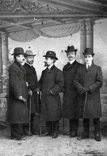 | Keywords: Ethnic Greeks of Monastir Bitola.JPG en Commemorative photograph of Greek Macedonian officials of the Consulate in Monastir modern Bitola From left to right N Kontogouris P Sarros V Agorastos Y Honaios and S Polihroniadis All of them dressed in formal attire posing indoors in an urban photograph el Αναμνηστική φωτογραφία των ροξενικών υ αλλήλων του ροξενείου οναστηριου Α ό αριστερά ρος τα δεξία διακρίνονται ο Κοντογούρης Π Σαρρός Β Αγοραστός Γ Χωναίος και ο Σ Πολυχρονιάδης ο Β Αγοραστός ήταν υ άλληλος Ο Κοντογούρης έλληνας αξιωματικός ου διοργάνωνε το αγωνιστικό- ατριωτικό κέντρο του οναστηρίου χρησιμο οιούσε την ιδιότητα του ροξενικού υ αλλήλου ως ρόφαση για να κρύψει την εθνική του δράση Όλοι τους ντυμένοι με αστική ε ίσημη ενδυμασία οζάρουν σε εσωτερικό χώρο φωτογραφείου Г ците во акедонија http //www imma edu gr/imma/dbs/Artifacts/index html lq CE A0 CE 93 CE 94 CE 9C start 536 show 1 Author Late 19th-early 20th Century Anonymous-EU People of Bitola Macedonians Greeks Georgios Honaios |