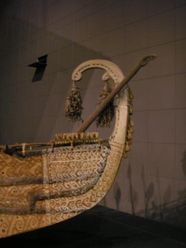 Keywords: Ethnologisches Museum Dahlem Berlin Mai 2006 014.jpg Detail of a blue-ocean ship from Luf off the coast of Papua New Guinea This boat was constructed in 1890 and brought to Berlin in 1904 It was used by the native population of Luf for trade and warfare For longer journeys into the open sea it could transport up to 50 persons A platform was used to transport goods To stabilise the ship depending on the winds the crews would move to different locations on the ship the platform and a small bridge The ship itself was carved out of a single large treetrunk Plant adhesive was used for insulation against the water The whole ship was constructed without a single nail all parts are held together with plant material The rectangular sails are typical for the region but unusual for the wider Oceanic region This ship is the last of its kind and kept at the Ethnologisches Museum Berlin-Dahlem The population of Luf became extinct in 1940 own 2006-05 Gryffindor I release it into the public domain Ship from Luf Ethnological Museum Berlin |