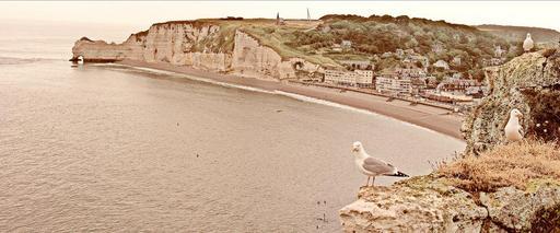 Keywords: etretat sea france normandy holiday travel port fishing village postkartenmotiv rock white cliffs d day defense attack storms conquer world war ii soldiers allied us military landing 1944 june war world war historically foot soldiers gulls funny panorama