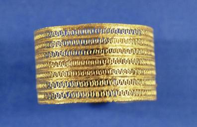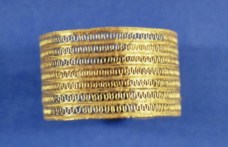 Keywords: Etruscan - Bracelet with Open Rows of Looped Wire - Walters 57395.jpg Composed of strips of openwork filigree; two smooth wires edged with twisted wires alternate with a waved smooth wire At the ends of the bracelet are strips composed of a waved smooth wire between twisted wires The clasp of the bracelet consists of two waved smooth wires between smooth and twisted wires with a hook and eye for attachment century 7 BC gold cm 2 5 4 3 4 2 accession number 57 395 10255 Joseph Brummer New York Yugoslavian treasure Henry Walters city Baltimore Walters Art Museum Henry Walters Acquired by Henry Walters 1927 Jewelry - Ancient to Modern The Walters Art Gallery Baltimore 1979-1980 Gold Jewelry Craft Style and Meaning from Mycenae to Constantinopolis Museum of Art Rhode Island School of Design Providence 1983 place of origin Pontos in present-day Turkey Walters Art Museum license Etruscan jewellery Etruscan art in the Walters Art Museum Jewellery in the Walters Art Museum Media contributed by the Walters Art Museum needs category review |