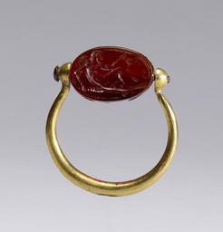 | Keywords: Etruscan - Gem with Herakles at Rest - Walters 42494 - Back.jpg This gem shows Herakles reclining to left resting on the lion skin The lion tail is visible between the hero's legs while fur and paw appear behind his back and below his right leg His right hand rests with the club on the ground next to him while he raises a large kantharos with his left in front or him A palm tree behind the hero indicates scenery Depictions of Herakles reclining are attested as early as the 6th century BC but the sculptural type was introduced only in the 4th century BC It shows the almost always aged and bearded hero resting from his labors and as symposiast associating him with the world of Dionysos It became a popular and widespread theme in Hellenistic and Roman times see LIMC 4 1988 s v Herakles 777 1st half 5th century BC carnelian set in a modern gold ring Ring H 3/8 x W 1 x D 1in 1 x 2 54 x 2 54cm ; Gem cm 1 1 5 accession number 42 494 8268 Henry Walters Baltimore date and mode of acquisition unknown Walters Art Museum Henry Walters Acquired by Henry Walters Heroes Mortals and Myths in Ancient Greece The Walters Art Museum Baltimore; Frist Center for the Visual Arts Nashville; San Diego Museum Of Art San Diego; Alexander S Onassis Public Benefit Foundation USA New York 2009-2011 place of origin Etruria in present-day Italy Walters Art Museum license Etruscan art in the Walters Art Museum Jewellery in the Walters Art Museum Heracles in Etruscan art Heracles as an old man Heracles wearing Nemean lion fur skin |