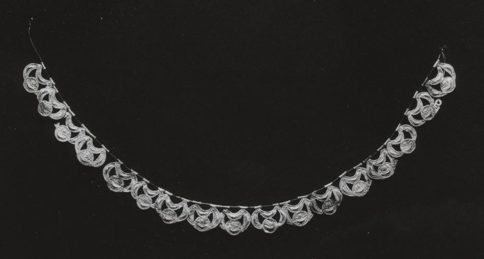 | Keywords: Etruscan - Seventeen Sections of a Necklace - Walters 57407.jpg These pieces are decorated with filigree and repoussé century 7 BC gold cm 42 l ; each unit cm 2 2 45 1 accession number 57 407 20718 Joseph Brummer New York Yugoslavian treasure Henry Walters city Baltimore Walters Art Museum Henry Walters Acquired by Henry Walters Jewelry - Ancient to Modern The Walters Art Gallery Baltimore 1979-1980 place of origin Etruria in present-day Italy Walters Art Museum license Etruscan art in the Walters Art Museum Jewellery in the Walters Art Museum Media contributed by the Walters Art Museum needs category review |