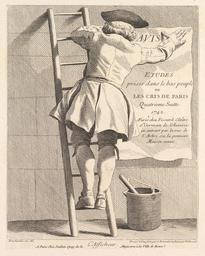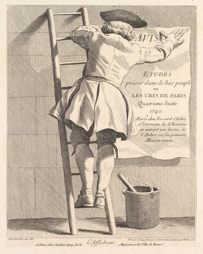 | Keywords: Études prises dans le bas peuple ou les Cris de Paris - L’Afficheur.jpg Assessments 1 L ™Afficheur The Sign Poster Billsticker on a ladder sticking a poster on a wall 1742 Etching with some engraving image 9 x 7 1/16 in 22 9 x 18 cm sheet 9 3/8 x 7 1/8 in 23 8 x 18 1 cm Institution Metropolitan Museum of Art 3354286 object history exhibition history credit line Harris Brisbane Dick Fund 1953 <gallery> File FOURNEL 1887 p056 Fig 30 jpg File Man posting an advertisement for La publicité en France par Emile Mermet jpg</gallery> 399123 Inscription In image Etudes Prises dans le Bas Peuple ou Les Cris de Paris Quatrieme Suitte 1742 AParis chez Fessard Cloître St Germain de l ™Auxerois en entrant par la rue de l ™Arbre sec la premiere Maison neuve Below image on left Bouchardon inv del ; centered L ™Afficheur ; on right Gravé à l ™eau forte par Cx Et terminé au burin par Et Fessard Bottom centered A Paris Chés Joullain Quay de la Megisserie à la Ville de Rome accession number 53 600 588 37 PD-100 Études prises dans le bas peuple ou les Cris de Paris Engravings of people in Paris Etchings of Paris Rue de l'Arbre-Sec Paris Engravings in the Metropolitan Museum of Art Etchings in the Metropolitan Museum of Art Images of Paris from the Metropolitan Museum of Art Edmé Bouchardon Men at work in art Billstickers Posters in Paris Ladders in art Buckets in art Ladders in Paris Wooden ladders in France Buckets in Paris Featured picture sets of Paris Afficheur |