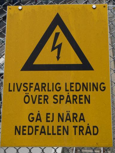 | Keywords: EU-SE-Stockholm-Tvärbanan warning.JPG Warning sign at Tvärbanan tramway in Stockholm Sweden Lethal conductor above the tracks Do not go near downed wires Varningsskylt vid Tvärbanan i Stockholm i Sverige Livsfarlig ledning över spåren Gå ej nära nedfallen tråd own Dmitry G 2010-06-01 Electricity warning signs black lighting in yellow triangle Tvärbanan |