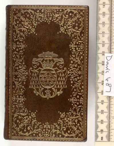 Keywords: Eucologe ou livre d'Eglise imprime par l'ordre de Monseigneur l'Archeveque de Rouen a l'usage de son diocese - Upper cover (Davis487).jpg Style Armorial Dentelle Bird motif; Caption Upper cover; Colour Brown; Edge Marbled under gilt exhibition history Decorative Technique Tooled in gold; Cover Material Calf The older and younger Deromes seem to have shared tools object history Text 1739; Rouen; Rochefoucault Cardinal Dominique de la object type Cc-zero place of creation Binding France place of discovery See M M Foot The Henry Davis Gift vol I London 1978 p 200 Pascal Ract-Madoux Essai de classement chronologique des étiquettes de Derome le Jeune 1989; Les Derome Jacques-Antoine Charles Nicolas et Nicolas-Denis 100 reliures dont 9 en mosaïque exhibition Bibliothèque nationale 1990 British Library image http //www bl uk/catalogues/bookbindings/LargeImage aspx RecordId 020-000004164 ImageId ImageId 41687 Copyright BL Eucologe ou livre d'Eglise imprime par l'ordre de Monseigneur l'Archeveque de Rouen a l'usage de son diocese Uploaded with GWToolset Eucologe ou livre d'Eglise imprime par l'ordre de Monseigneur l'Archeveque de Rouen a l'usage de son diocese - Upper cover Davis487 http //www webarchive org uk/bldatasets/bindings/6203_4 jpg Bookbinding 18th-century bookbinding British Library Bookbindings |