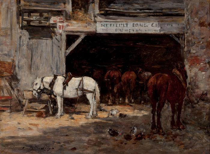 | Keywords: Eugène Boudin - Écurie.jpg Artwork Creator Eugène Boudin Écurie Stall oil panel cm 24 1 31 8 object history Dormeuil Paris and sold Hôtel Drouot Paris February 10 1936 no 75 ; Durand-Ruel Paris acquired at the above sale and until 1940 ; Galerie Bernier Paris; Dr Fritz Nathan and Dr Peter Nathan Zurich Switzerland label verso ; Christie's New York November 15 1983 Sale 531 lot 1 label verso ; Collection of Lois and the Honorable Frank R Lautenberg West Orange New Jersey; sold at Heritage Auctions 2012 11 15 sale 5118 lot 72016; http //www sothebys com/en/auctions/ecatalogue/2013/impressionist-modern-art-day-sale-n08988/lot 569 lotnum html sold 2013 05 08 by Sotheby's New York sale N08988 lot 569 credit line Signed lower left Boudin accession number http //fineart ha com/c/item zx saleNo 5118 lotIdNo 18002 Heritage Auctions PD-old-100 Paintings by Eugène Boudin Paintings of horses Horse stables in art Images from Heritage Auctions |