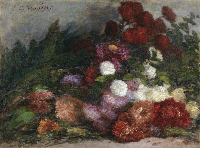 | Keywords: Eugène Boudin - Jeté de Fleurs.jpg Artwork Creator Eugène Boudin Jeté de Fleurs oil canvas cm 35 46 2 object history LangSwitch Signed upper left Signé en haut à gauche E Boudin accession number http //www sothebys com/de/catalogues/ecatalogue html/2012/tableaux-et-dessins-anciens-et-du-xixe-sicle /r /de/ecat fhtml PF1209 html+r m /de/ecat lot PF1209 html/139/ Sotheby's PD-old-100 Still life painting of flowers Images from Sotheby's Still life paintings by Eugène Boudin | ||||
