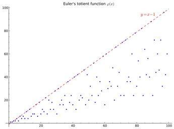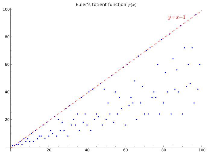 MAKE A MEME View Large Image EulerPhi100.svg Sage 6 1 1 Script <pre> P point t euler_phi t for t in srange 1 100 + plot x-1 x 0 100 linestyle -- color red title Euler's totient function \\varphi x + text y x - 1 87 94 color red fontsize 14 P save EulerPhi100 svg ...