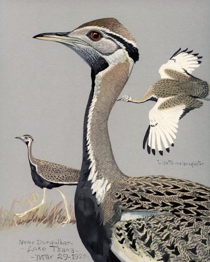 | Keywords: Eupodotis melanogasterEYP18A.jpg Black-bellied Bustard Black-bellied Korhaan Eupodotis melanogaster syn Lissotis melanogaster offset reproduction of watercolor Album of Abyssinian Birds and Mammals from Paintings by Louis Agassiz Fuertes Chicago Field Museum of Nautral History 1930 creator Louis Agassiz Fuertes public domain--published in the United States without copyright No copyright notice was placed on reproductions or attached materials and such notice was required at that time Also reproduction of art-work where artist died more than 70 years ago PD-old-auto-1923 1927 PD art uploaded by Patrick Coin Album of Abyssinian Birds and Mammals Lissotis melanogaster |