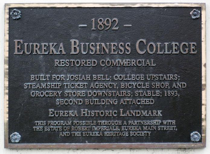 Keywords: Eureka CA Eureka Business College.jpg en Eureka Historical Building plaque at 430 Second Street Eureka CA Original Photo by Me Ellin Beltz 2012-02-22 Transcription 1 style border-collapse collapse; - align center <B><big> “1892 “ E</big>UREKA <big>B</big>USINESS <big>C</big>OLLEGE RESTORED COMMERCIAL</B> BUILT FOR JOSIAH BELL; COLLEGE UPSTAIRS; STEAMSHIP TICKET AGENCY BICYCLE SHOP AND GROCERY STORE DOWNSTAIRS; STABLE; 1983 SECOND BUILDING ATTACHED <B><big>E</big>UREKA <big>H</big>ISTORIC <big>L</big>ANDMARK</B> <small>THIS PROGRAM POSSIBLE THROUGH A PARTNERSHIP WITH THE ESTATE OF ROBERT IMPERIALE EUREKA MAIN STREET AND THE EUREKA HERITAGE SOCIETY</small> Historical markers in Humboldt County California Taken with Panasonic Lumix DMC-FX12Photographs by Ellin Beltz |