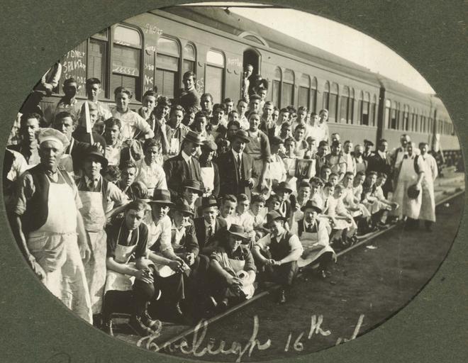 | Keywords: archives state records nsw staterecordsnsw newsouthwales blackandwhite workers railways staff people railway strike railwaystrike children eveleigh workshops eveleighworkshops workshops srnsw:series=15309 uniforms clothing hats black and white Public school boys undertaking the work at the railway during the strike. From the photographic album donated by W.J. Ellis to the Chief Commissioner of Railways James Fraser. Dated: 16 August 1917 Digital ID: 15309_a015_a015000009 Rights: www.records.nsw.gov.au/about-us/rights-and-permissions We'd love to hear from you if you use our photos. Many other photos in our collection are available to view and browse on our website using Photo Investigator. Public school boys undertaking the work at the railway during the strike. From the photographic album donated by W.J. Ellis to the Chief Commissioner of Railways James Fraser. Dated: 16 August 1917 Digital ID: 15309_a015_a015000009 Rights: www.records.nsw.gov.au/about-us/rights-and-permissions We'd love to hear from you if you use our photos. Many other photos in our collection are available to view and browse on our website using Photo Investigator. |